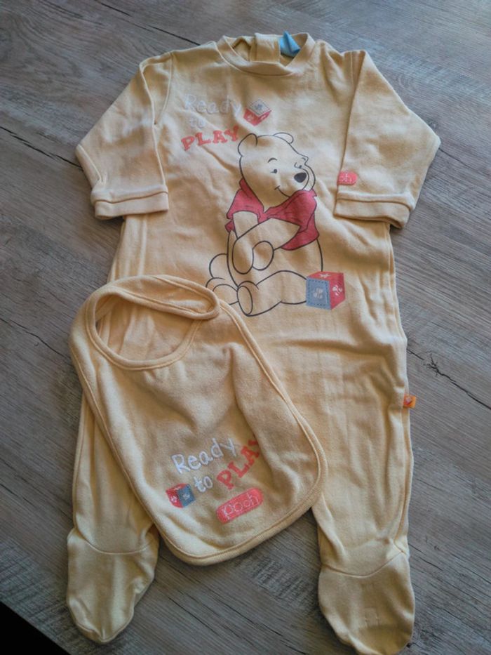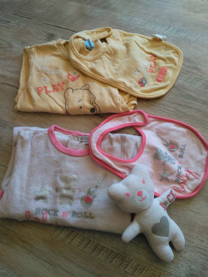 Lot de 2 pyjamas une pièce, en très bon état. Chaque pyjama a sa bavette assortie + un doudou assorti pour le pyjama rose clair. Marque Disney pour le jaune et In extenso pour le rose.