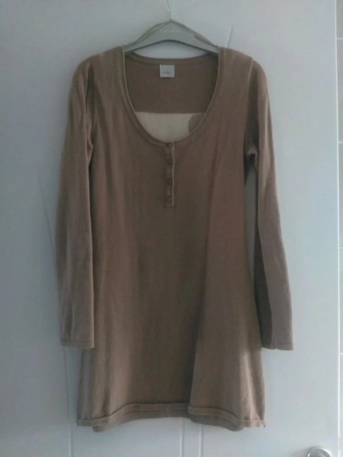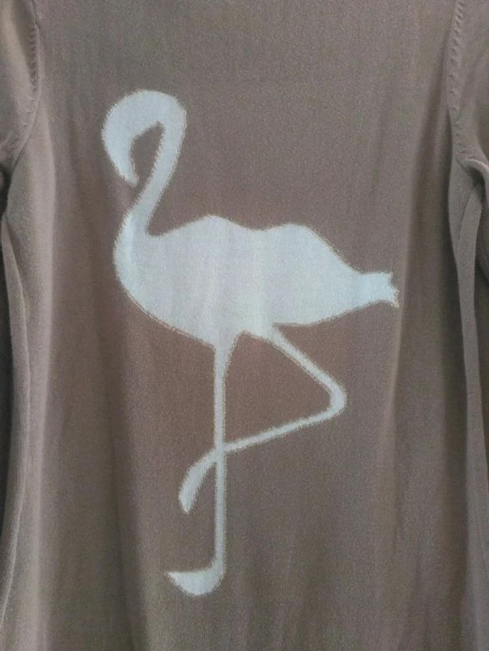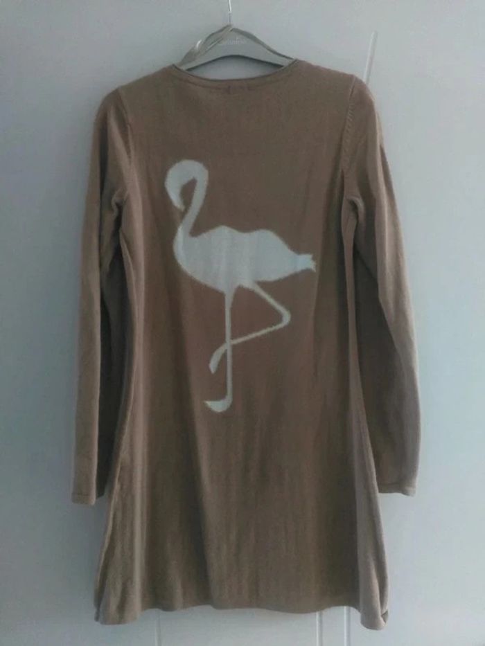 Robe hiver, marron clair avec motif flamand rose derrière de couleur blanche et doré. Très bon état, peu mise. Marque Camaïeu. Taille 1.