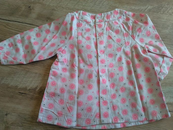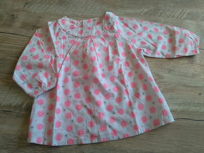 Tunique manches longues blanche avec motifs gris clair et rose. En excellent état. Taille 9 mois