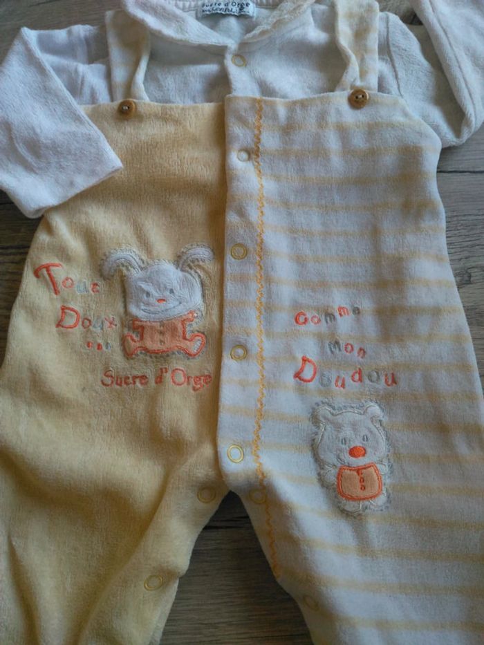 Pyjamas en très bon état, de marque Sucre d'Orge. 1 en taille Naissance ( blanc et vert clair) 1 en taille 3 mois ( blanc et jaune)