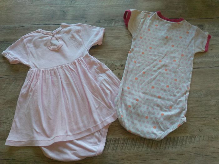 Lot de 2 bodys, de marque Petit Bateau. 1 body/ jupe rose clair 1 body blanc motifs pomme. Taille 24 mois.