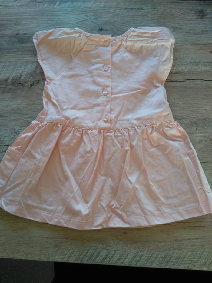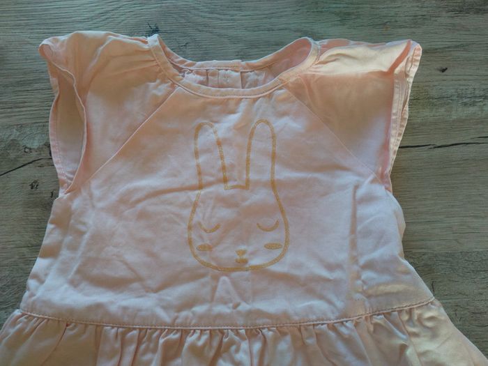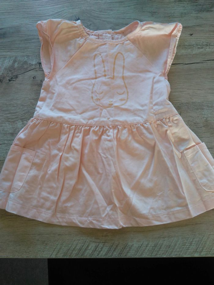 Jolie robe rose clair avec motif lapin doré sur le devant. Taille 12 mois.