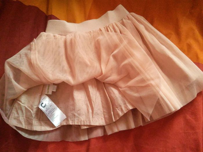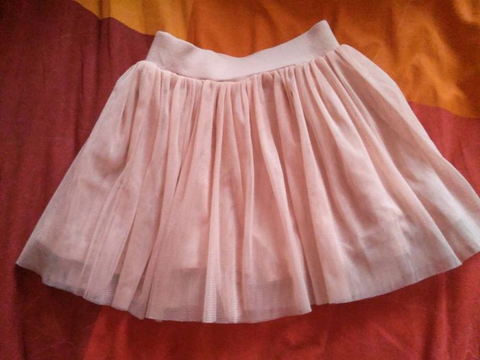 Jupe rose clair, réversible. 1 côté tulle, 1 côté tissu à petits pois. En très bon état. Taille 2 ans, Verbaudet.