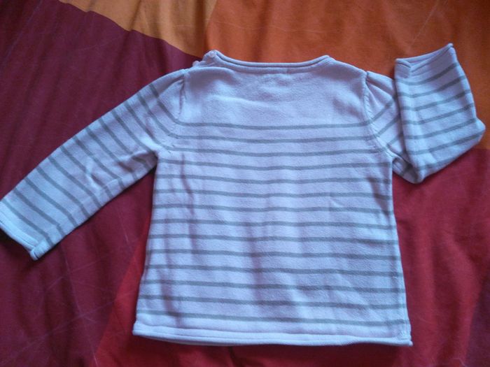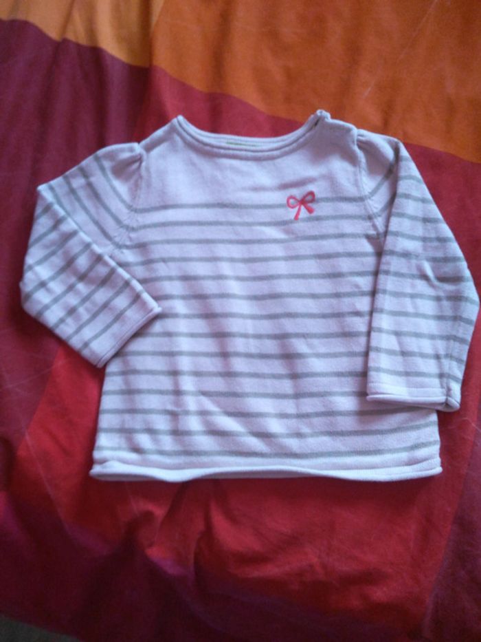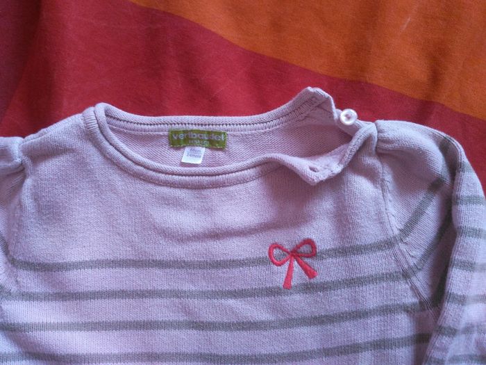 Pull rose clair, à rayures horizontales marron clair. Petit noeud brodé, rose foncé. Très bon état. Vertbaudet, taille 24 mois/ 86 cms.