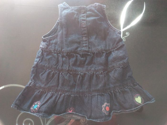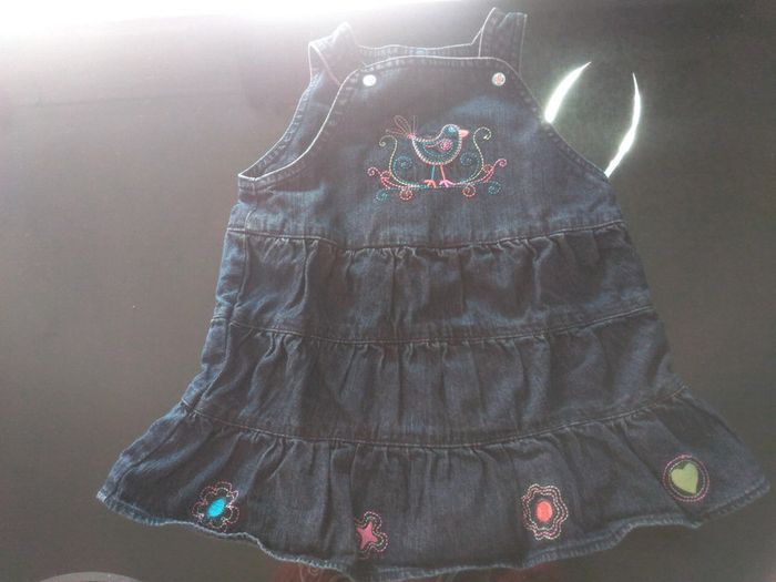 Robe salopette en jean avec motifs colorés, en très bon état. Taille 6 mois.