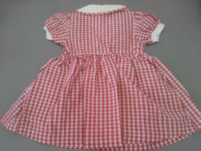 Jolie robe à carreaux rouge et blanc, motifs brodés et boutons en forme de fleurs. Taille 12 mois.