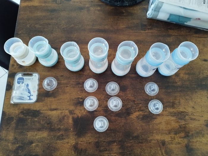 Je vends ce lot de biberons MAM anti coliques qui se composent de : - 1 biberons 130ml - 2 biberons 160ml - 4 biberons 260ml - 3 tétines débit 0 (dont deux neuves, juste l'emballage est ouvert mais jamais utilisé) - 5 tétines débit 1 - 2 tétines débit 2 Tout les biberons sont en parfait état, les tétines aussi ☺️