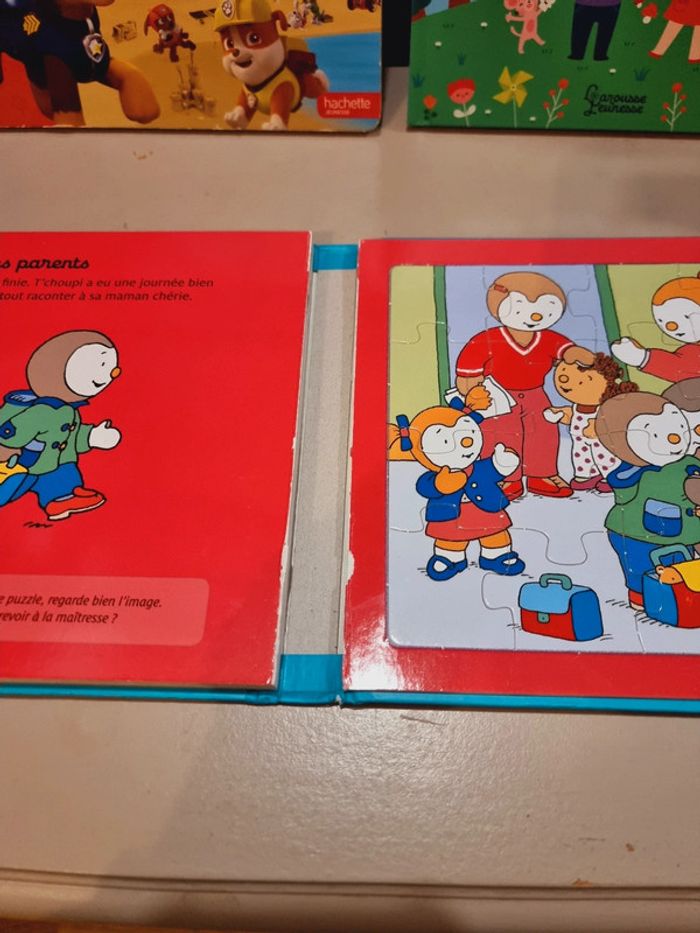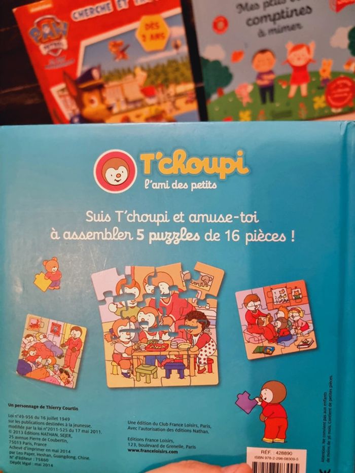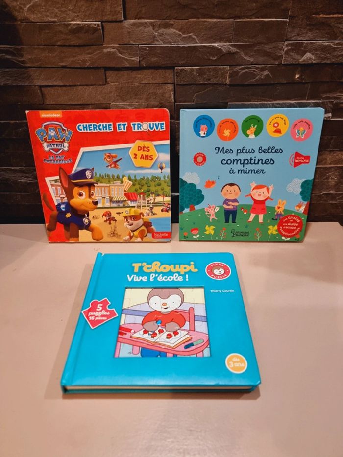 Lot 3 livres Cherche et trouve pat patrouille Mes plus belles comptines à mimer (sonore) Puzzle tchoupi vive l'école offert (manque une pièces et la couverture c'est décollé Bon état ⚠️ ne bénéficie pas des remises de lot #dodi68_jouet