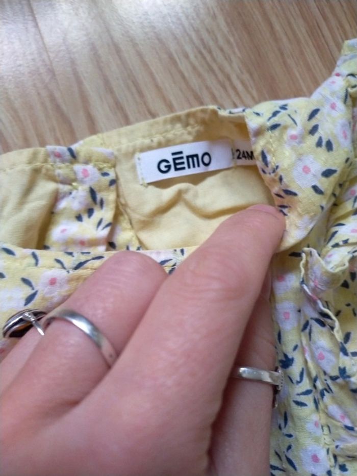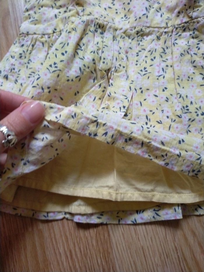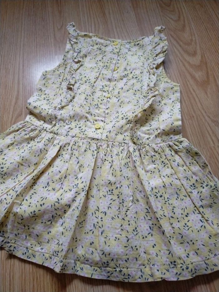 Très jolie robe fleurie jaune pâle petites fleurs blanches. Volantée. Fermé par boutons