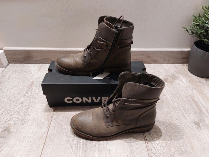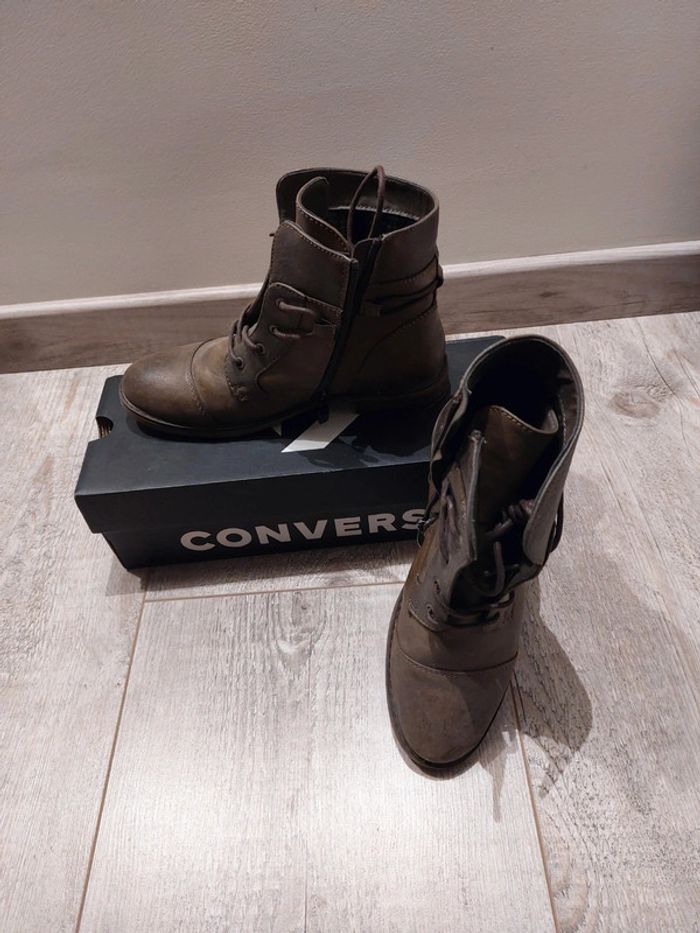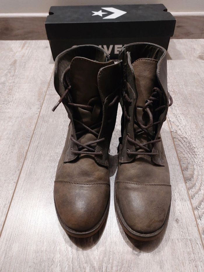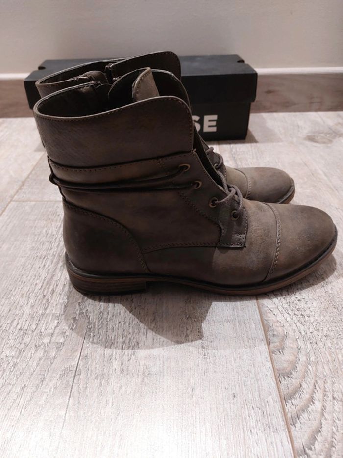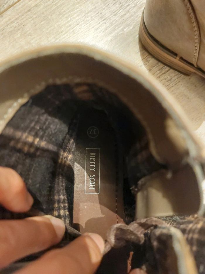 Jolies bottines motifs kaki, de la marque Merry Scott Taille 37. Très peu porté. Donc en très bon état.