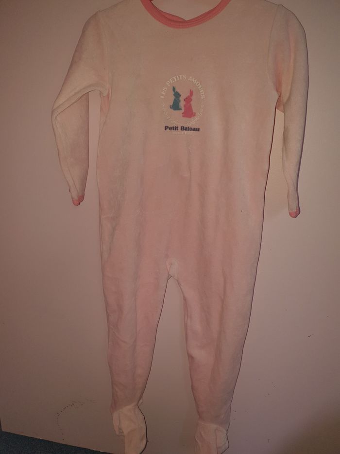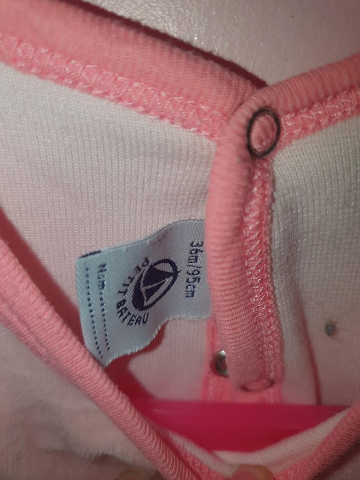 Pyjama Petit Bateau 1 pièce, avec pieds. Taille 36 mois. Comme neuf car était trop juste pour ma fille. En velours ras il est tout doux et magnifique. Couleur rose bonbon , motif petits lapins.