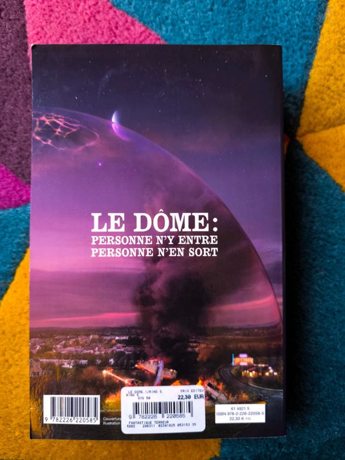 Très bon état Le Dôme : personne n'y entre, personne n'en sort. À la fin de l'automne, la petite ville de Chester Mill, dans le Maine, est inexplicablement et brutalement isolée du reste du monde par un champ de force invisible. Personne ne comprend ce qu'est ce dôme transparent, d'où il vient et quand ou si il partira. L'armée semble impuissante à ouvrir un passage tandis que les ressources à l'intérieur de Chester Mill se raréfient. Big Jim Rennie, un politicien pourri jusqu'à l'os, voit tout de suite le bénéfice qu'il peut tirer de la situation, lui qui a toujours rêvé de mettre la ville sous sa coupe. Un nouvel ordre social régi par la terreur s'installe et la résistance s'organise autour de Dale Barbara, vétéran de l'Irak et chef cuistot fraîchement débarqué en ville.