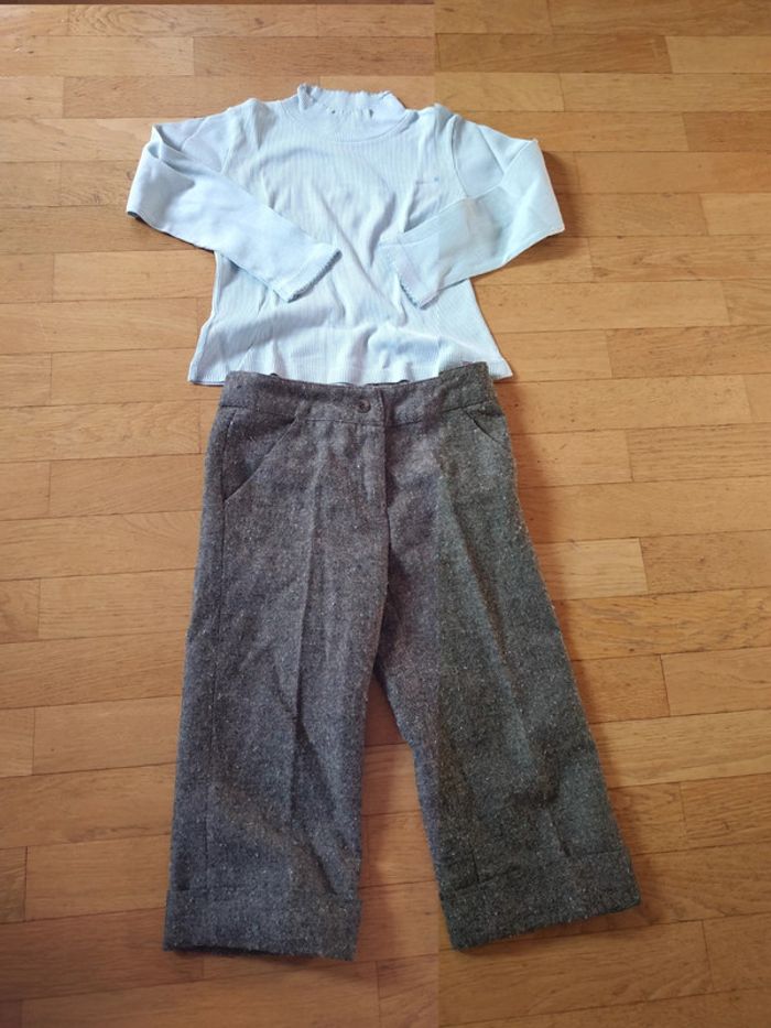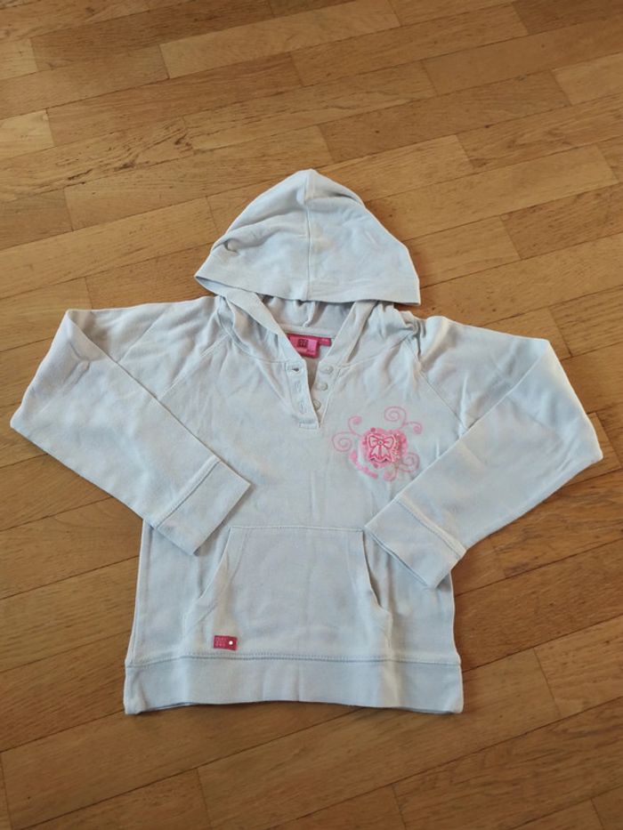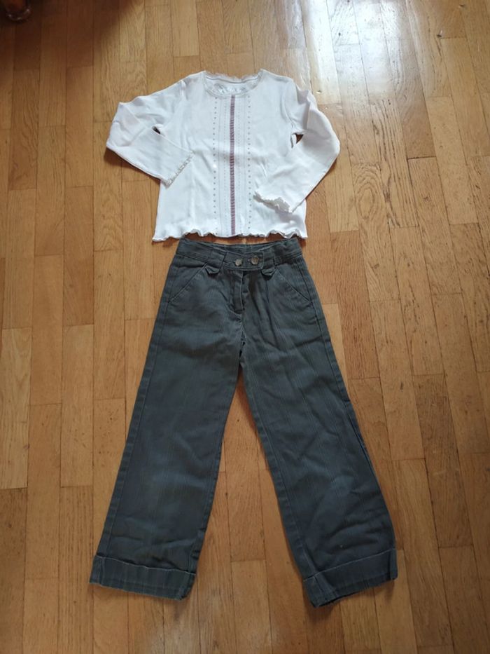 Tee-shirt turquoise clair Okaïdi avec pantacourt doublé, boutons / élastique réglable intérieur, Mila Blue( porté 2 fois) marron moucheté certains turquoise Tee shirt blanc paillettes Okaïdi avec pantalon 7/8 ( plus long que l'autre) Boutons élastique pr taille réglable, Mila Blue, kaki, porté, un peu délavé Tee shirt à capuche ,Complices, 2 points très légers poche ventrale #charlotte123417fille6ans