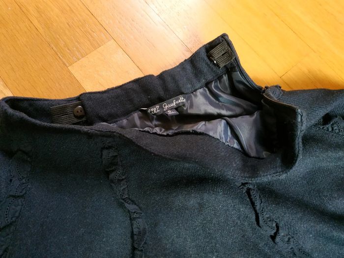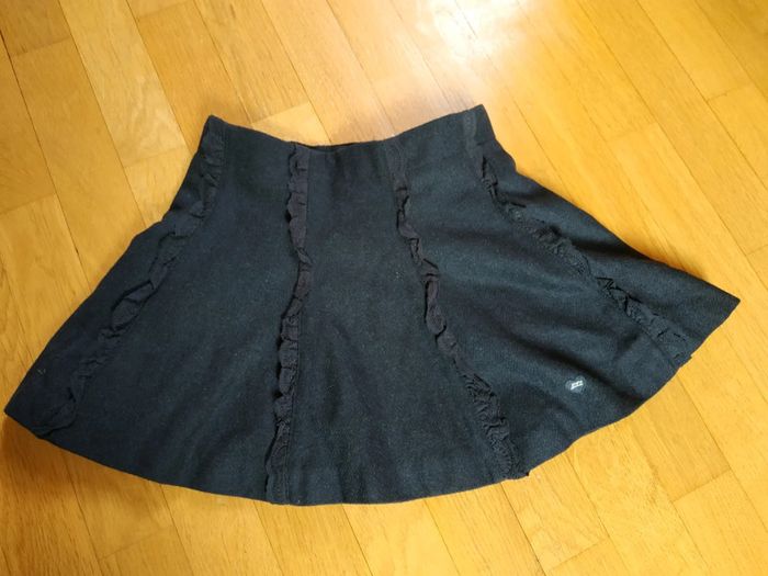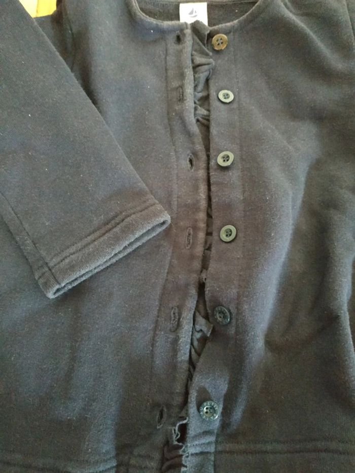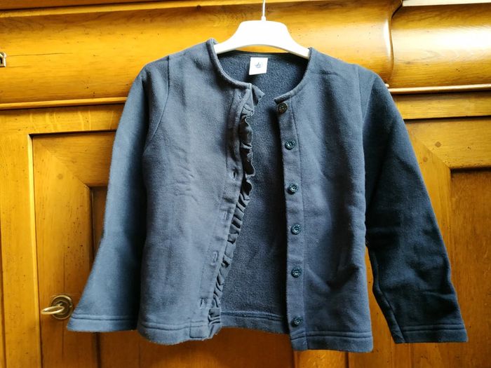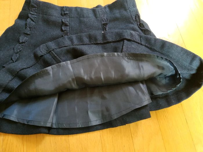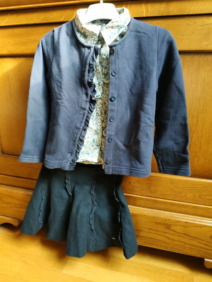 Gilet, façon sweat, PETIT BATEAU, un peu moins bleu marine bas manches et boutonnière, porté modérément. Jupe et chemisier LILI GAUFRETTE , portés 3 fois. Jupe 60% laine, doublée, fermeture éclair sur côté, réglable par élastique intérieur. #charlotte123417fille6ans