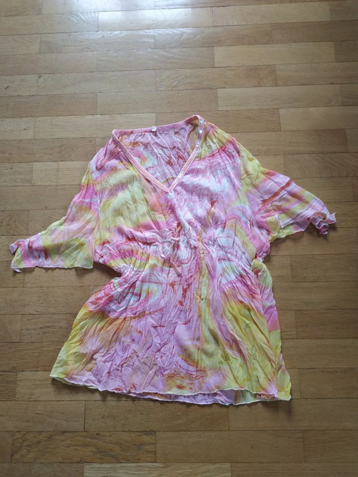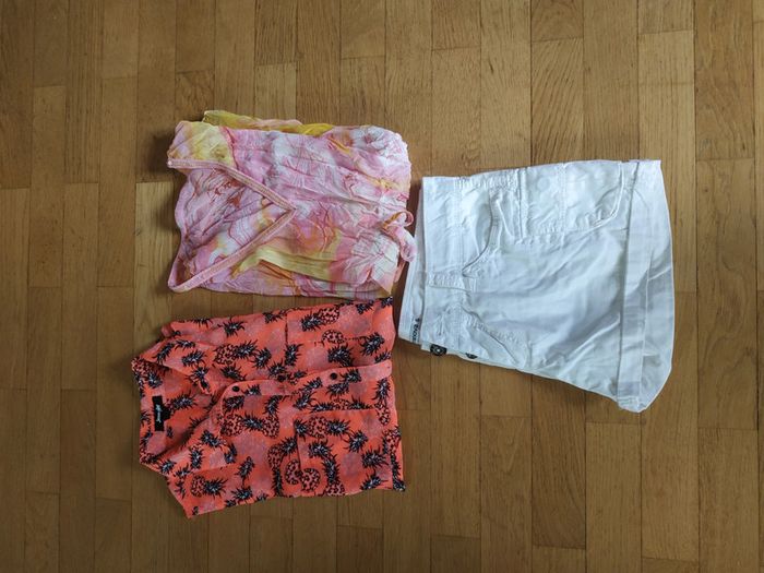 Short porté 1 fois TERRANOVA, légèrement moins blanc ( rangé depuis un moment) S Débardeur mousseline JENNYFER, S Tunique , marque ? Noté xl/xxl , mise par même personne pour plage, taille petit++ #charlotte123417femmeS36