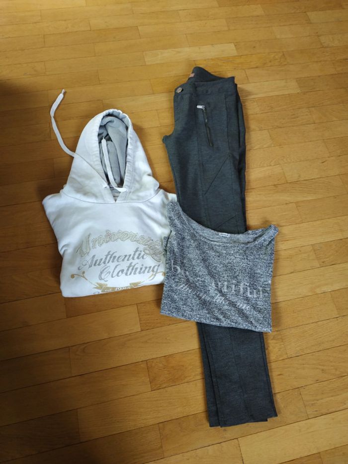 Pantalon Bershka, S,étiquette intérieure composition coupée. Epais, porté,propre Tee shirt Pimkie, S, porté, propre Sweat Cache cache, T1, un peu moins blanc #charlotte123417femmeS36
