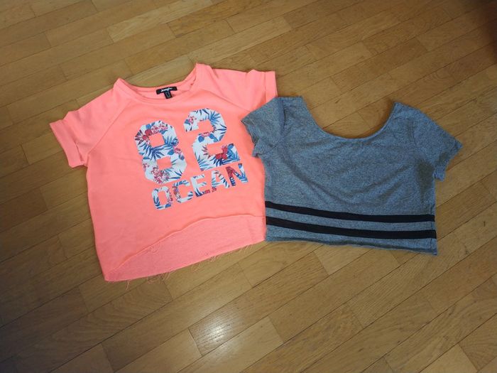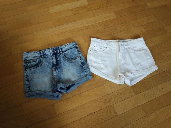 Short Pimkie jean: à repasser pr bien refaire pli bas short Haut gris: marque ? Étiquette coupée, fait 34 Short pull ans Bear, écru: porté 2 fois, épais Haut corail croq top Jennyfer, porté, propre, un peu pelucheux #charlotte123417femmeXS34