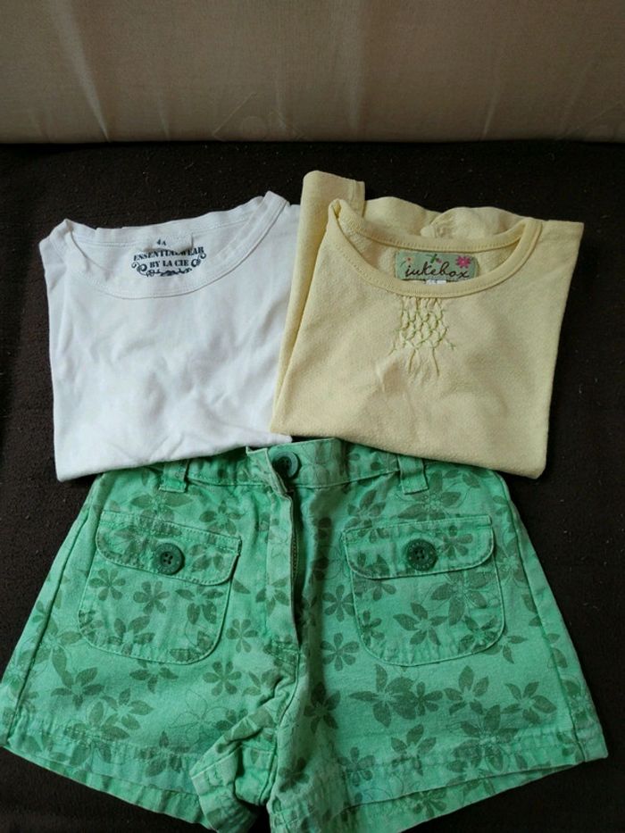 Short: Okaïdi, un peu blanchi Tee shirt blanc : compagnie des petits ( s'est traces légères jaunâtres) Tee shirt jaune : Gémo #charlotte123417fille4ans