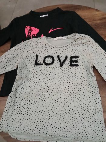 Je vends t-shirt manche longue taille 12 ans. Sur la manche il y a deux tâches de peinture. Jamais réussi à détacher... Peut-être que vous y arriverez.. ou sinon parfait pour les balades dans la forêt ou faire des choses salissantes..