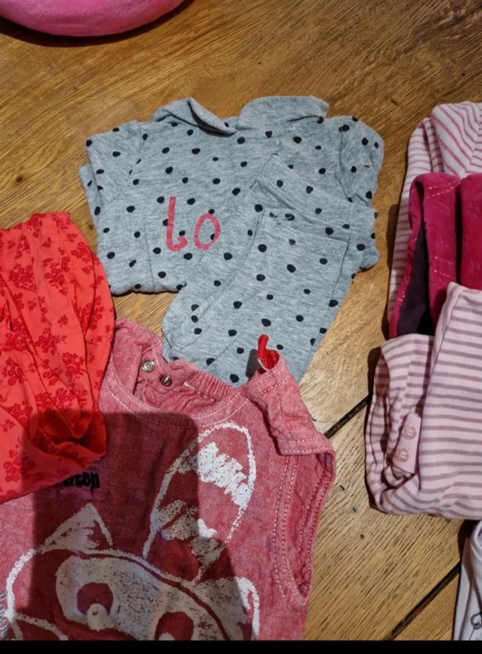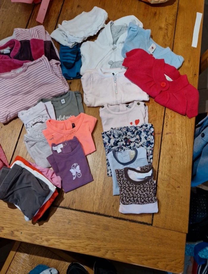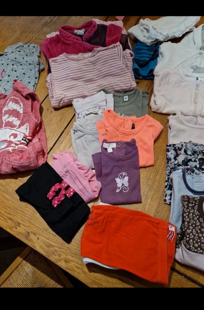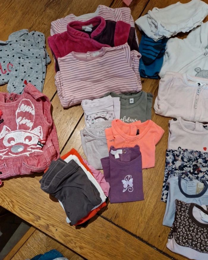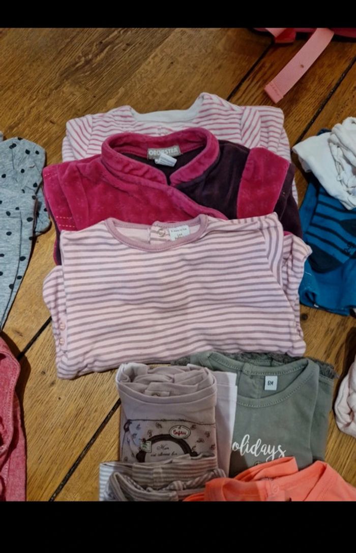 Lot 6 mois 2 veste 1 gillet manches longues 1 gillet manches courtes 5 Tee-shirt 4 pull léger 3 pyjama 4 pantalon 1 salopette 1 robe 1 ensemble 3 cullotte 1 collant Envoi rapide et soigné Réduction en lot