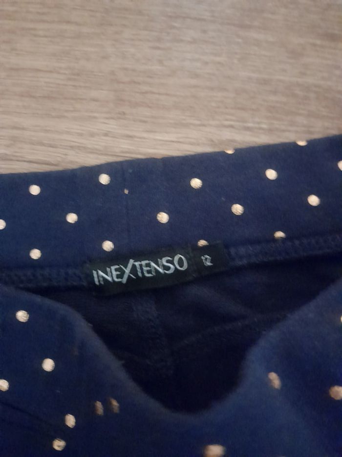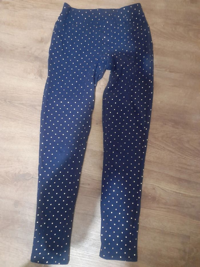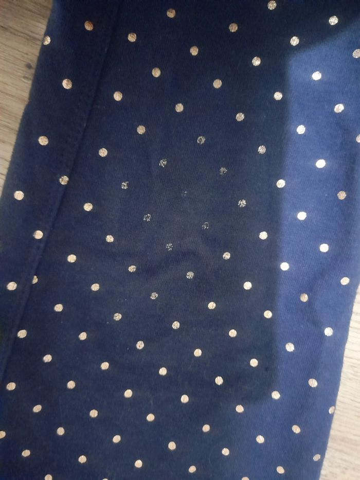 Legging bleu marine avec des points dorés Légère usure au niveau du genou (voir photo) Étiquette 12ans mais annonce j'ai mis 10ans car taille court