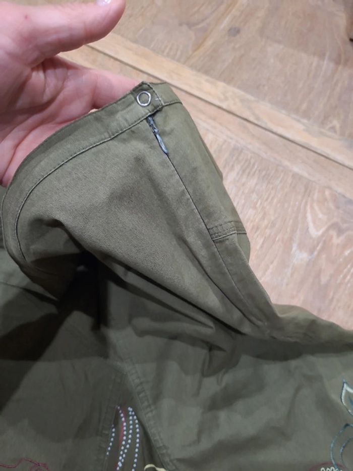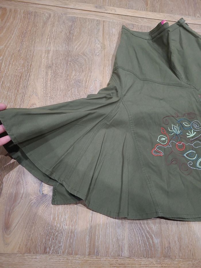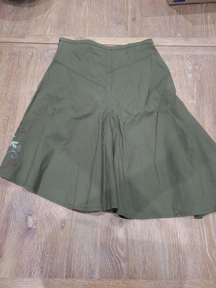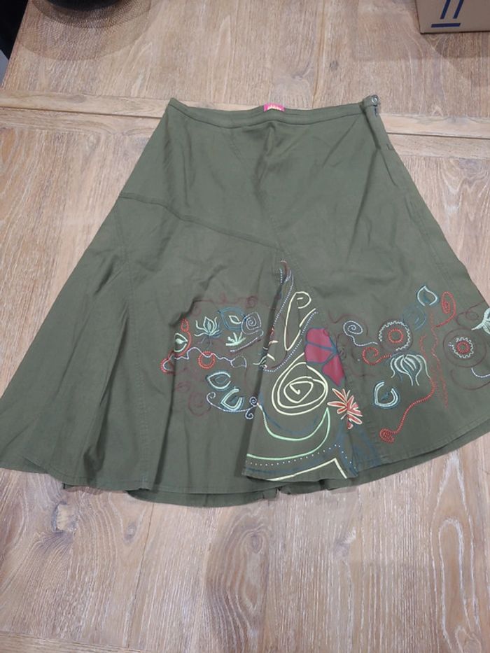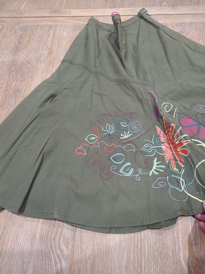 Jupe asymétrique vert kaki avec fleurs en relief "couturé" et en transfert. TBE Fermeture éclair et bouton pression sur le côté Mesure taille 38cm Hauteur jupe de 58 à 68cm de droite à gauche. En magnifique état !! Idéal automne avec ballerines ou hiver avec bottes Envoi rapide et soigné