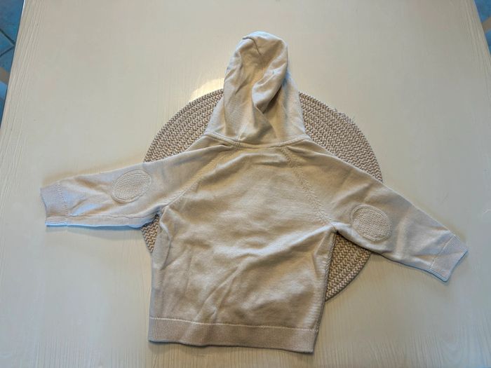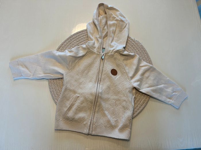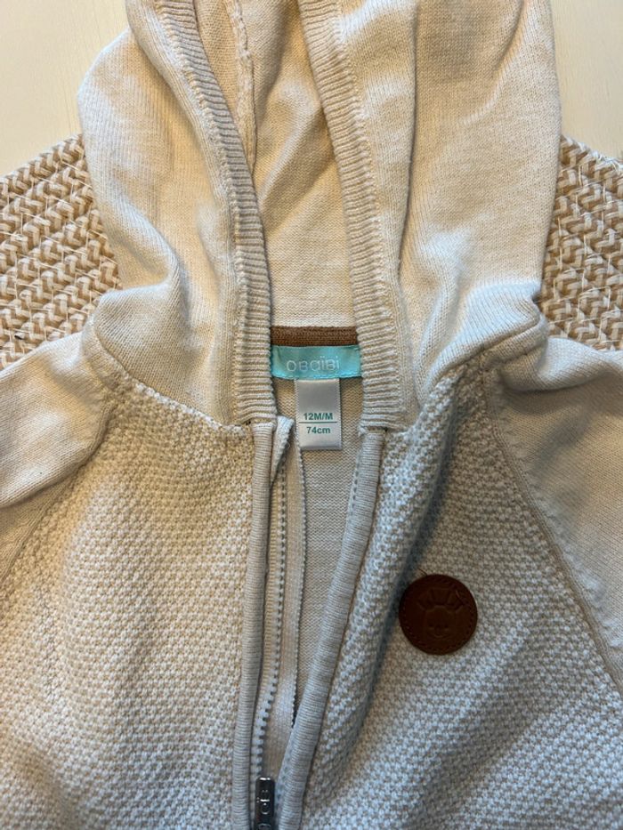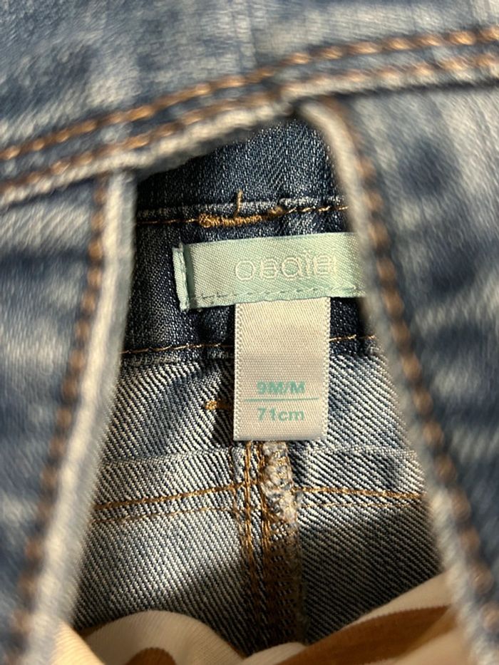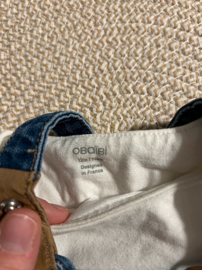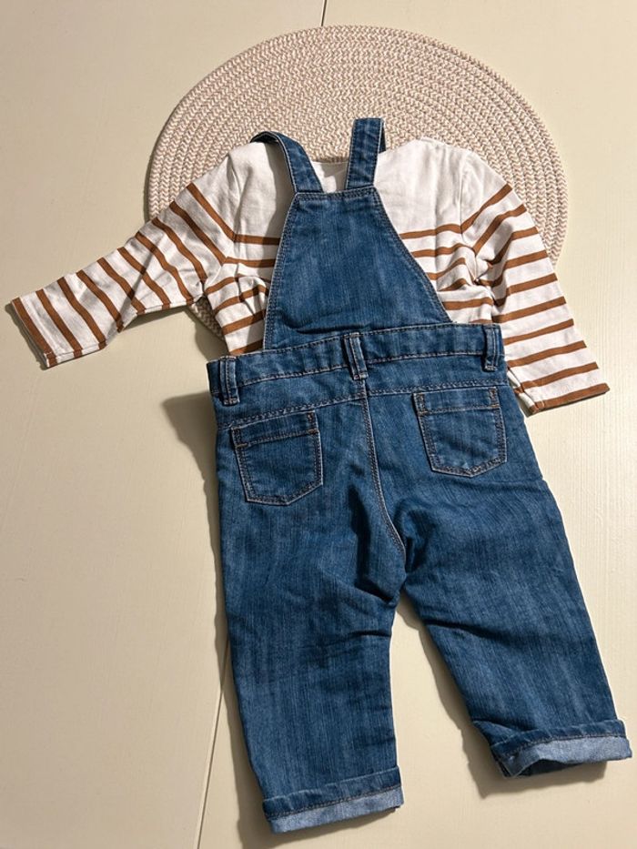 Ensemble salopette en jeans avec tee-shirt rayé marron et blanc avec gilet beige à capuche. Taille 12 mois