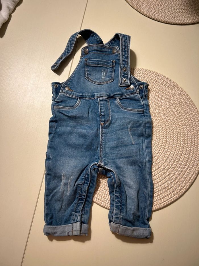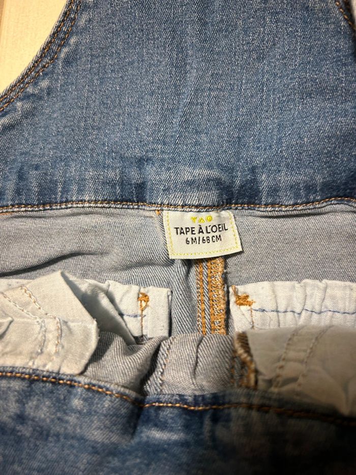 Salopette longue en jeans taille 6 mois fermeture pour l’ouverture des jambes.