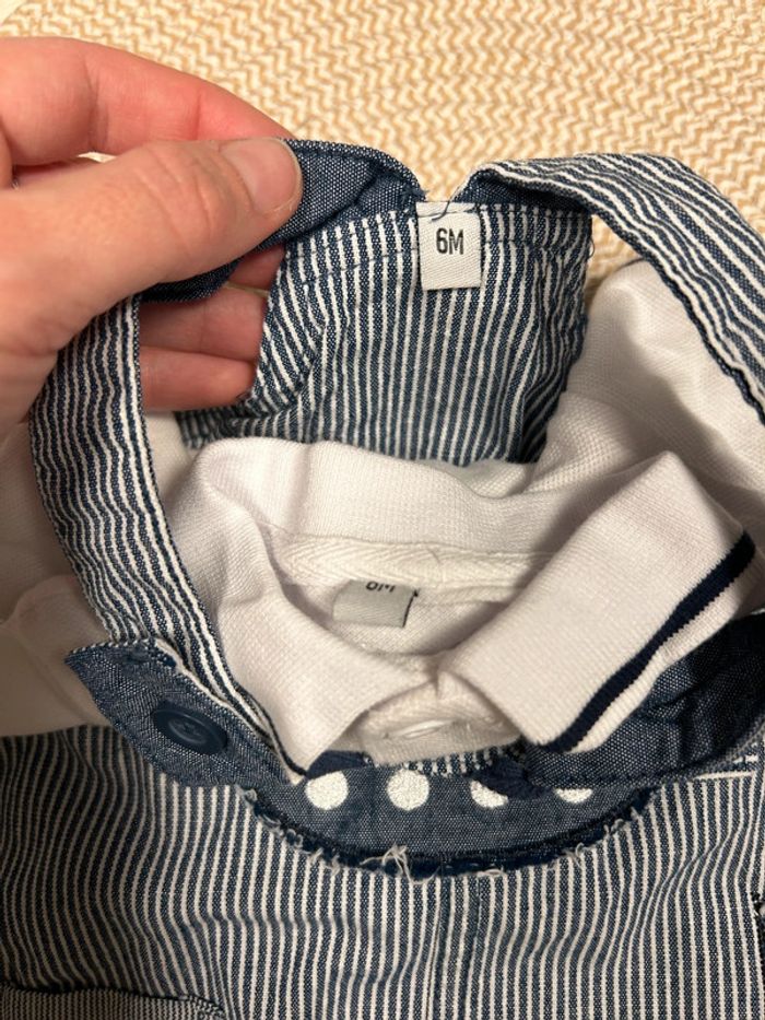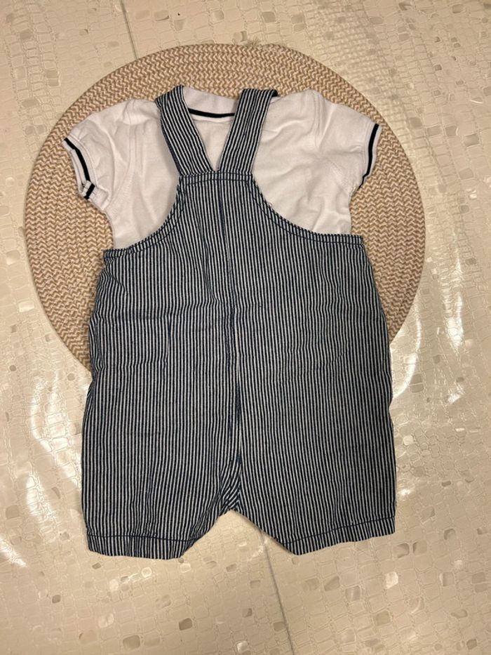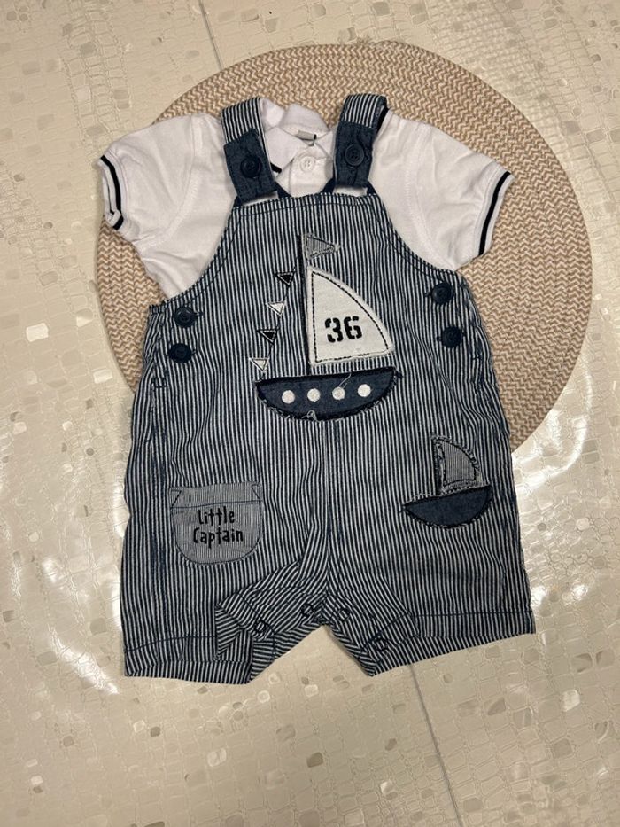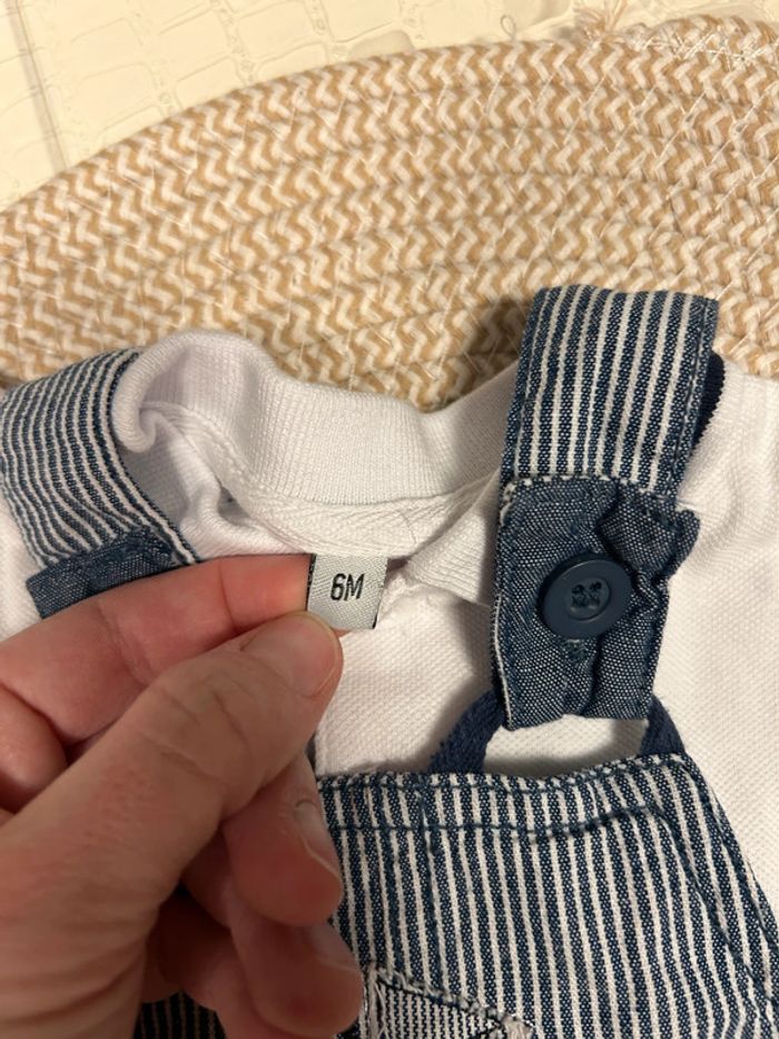 Ensemble d’été salopette courte rayée avec dessin bateau + polo blanc. Taille 6 mois.