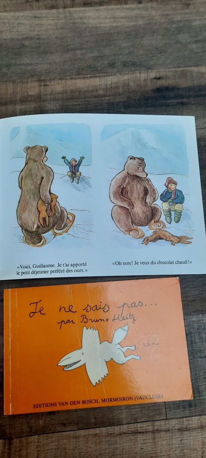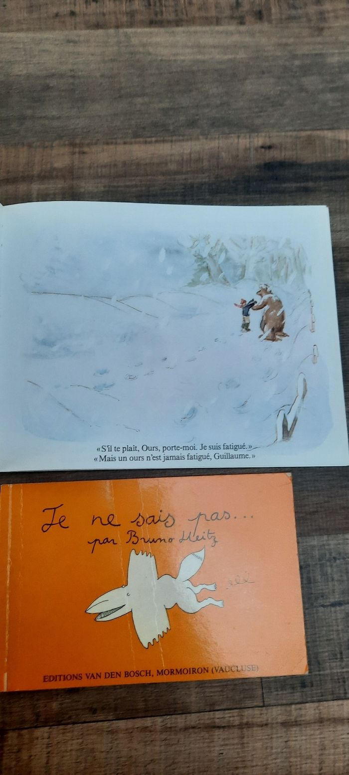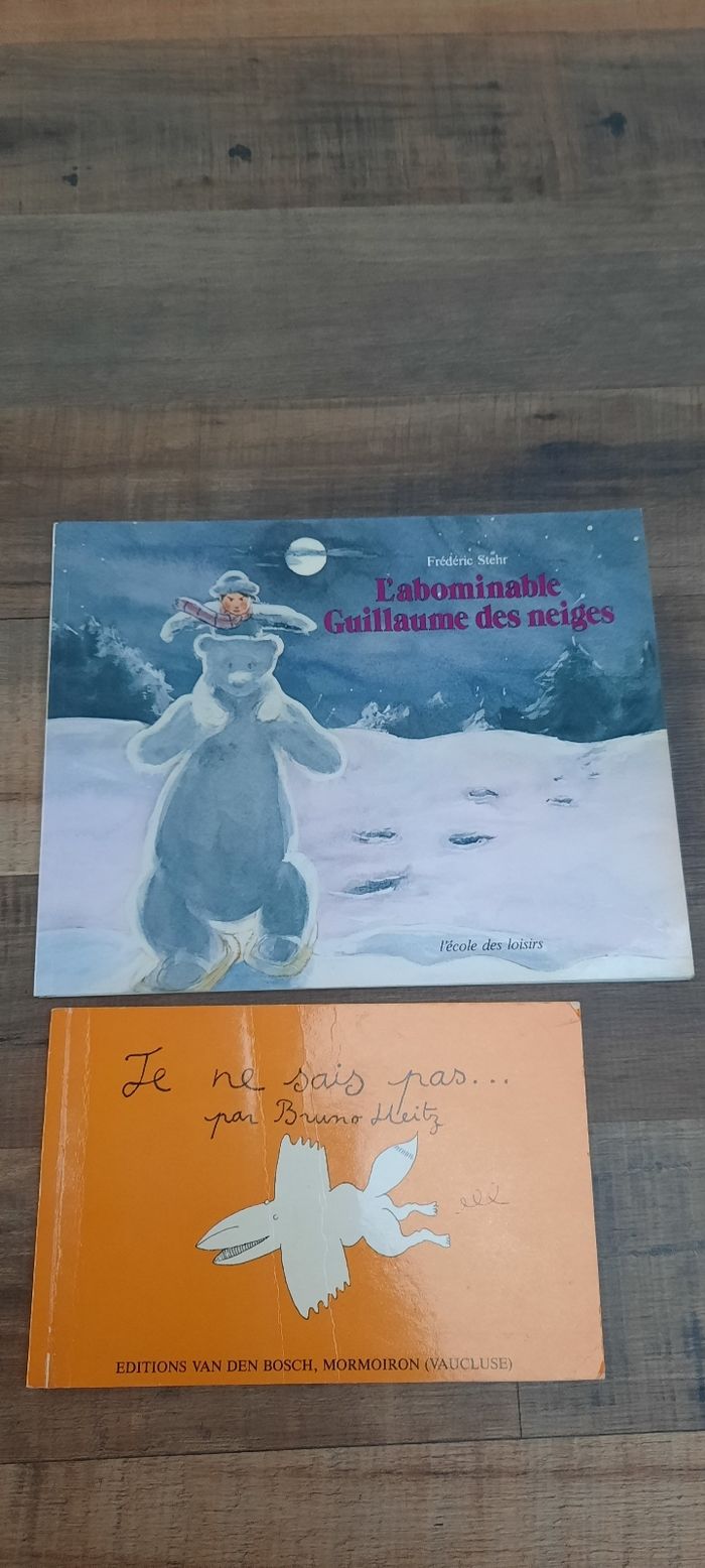 2 livres:" l'abominable Guillaume des neiges" et "je ne sais pas ". Les pages sont en très bon état mais la couverture du livre orange est marquée et il y a du blanco sur la 1ere page du livre avec l ours et l arrière un peu jauni (cf photos). Ce sont de très vieux livre donc vu leur nombre d années ils ne sont pas si mal.