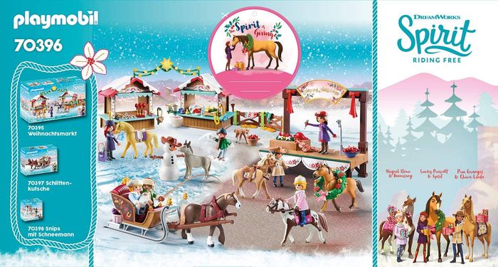 Playmobil Spirit Scène de Concert 70396 Le PlaySet comprend Lucky avec Spirit et Pru avec Chica Linda ainsi qu'une scène en bois avec des décorations de Noël et un microphone sur pied, un violon et une couronne décorative ainsi que de nombreux autres accessoires. La couronne décorative de Noël peut être placée autour du cou de tous les chevaux. C'est bientôt l'heure du concert, Lucky s'entraîne à chanter devant son amie et organise les derniers préparatifs. Les personnages se préparent pour offrir un super spectacle. Avec Lucky, Spirit et Chica Linda. Contient une scène de concert. NE CONVIENT PAS AUX ENFANTS DE MOINS DE 4 ANS !!