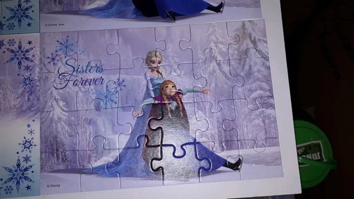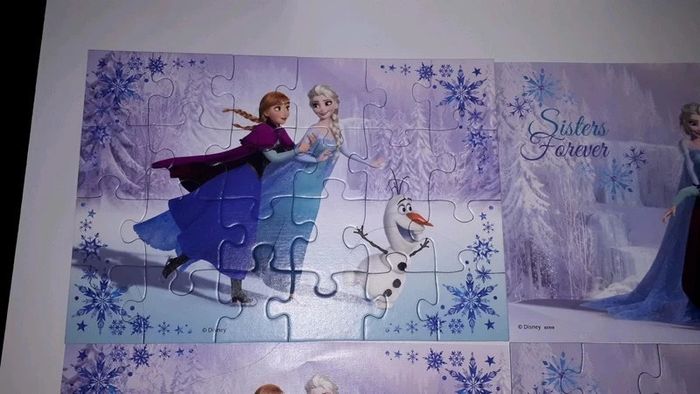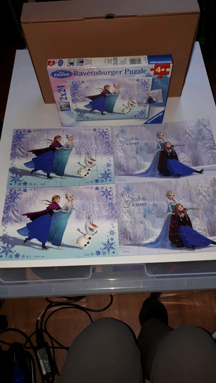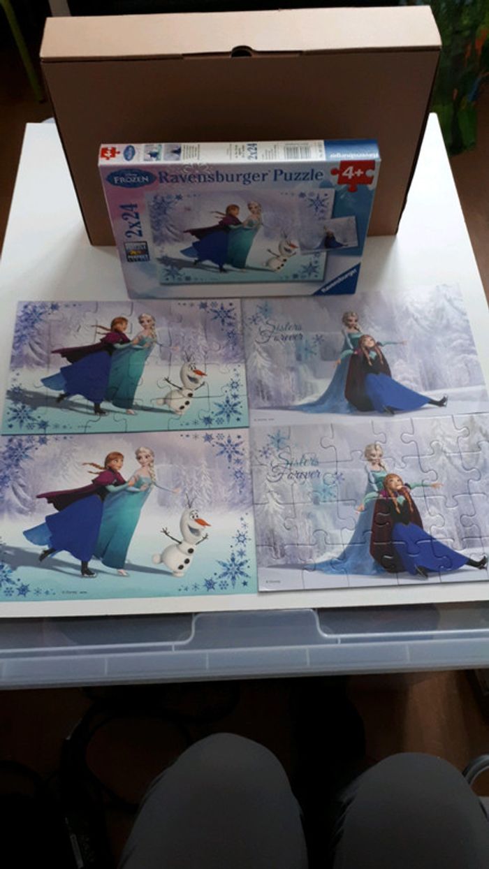 Puzzles de la Reine des Neiges de Ravensburger. La boîte comprend 2 de 24pcs, ils sont complet, en très bon état, malgré le bord d'une pièce est légèrement abîmée (cf dernière photo)