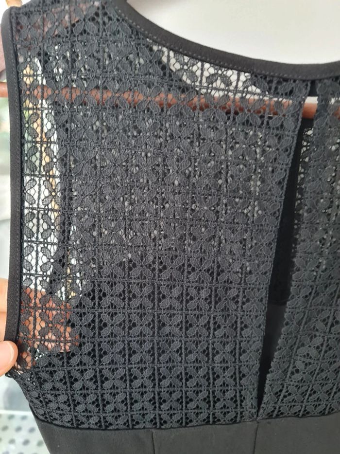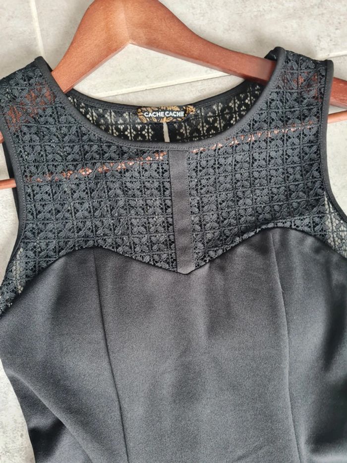 Petite robe noire forme patineuse Cache Cache taille 34. Sans manche, cintrée puis évasée à partir de la taille, tissu de bonne qualité, très joli tombé. Dentelle fleur dans dos (petite ouverture "goutte" )et au dessus du décolleté et en bas de la robe Poitrine doublée avec mousse fine. Fermeture sur côté. Longueur totale 87cm. Neuve, jamais portée (trop étroite au niveau de la poitrine). Articles lavés avant la vente, maison non fumeur.