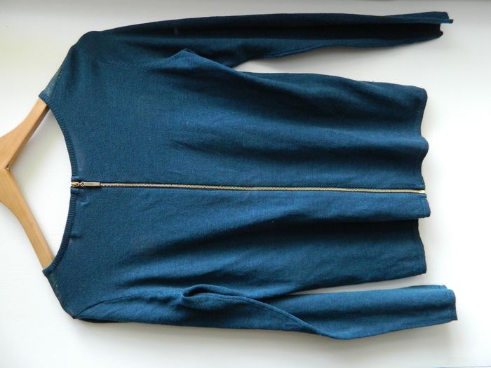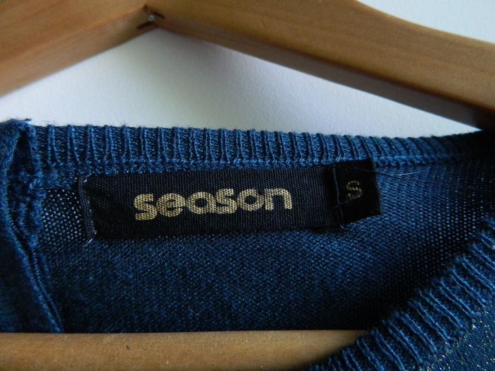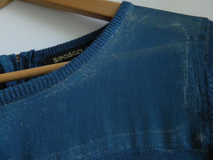 Pull femme T S Marque "Season" Bleu canard Haut transparent avec paillettes Dos zippé En polyester, acrylique,nylon et laine (15 %) Très bon état Envoie sous 48 h