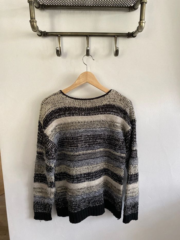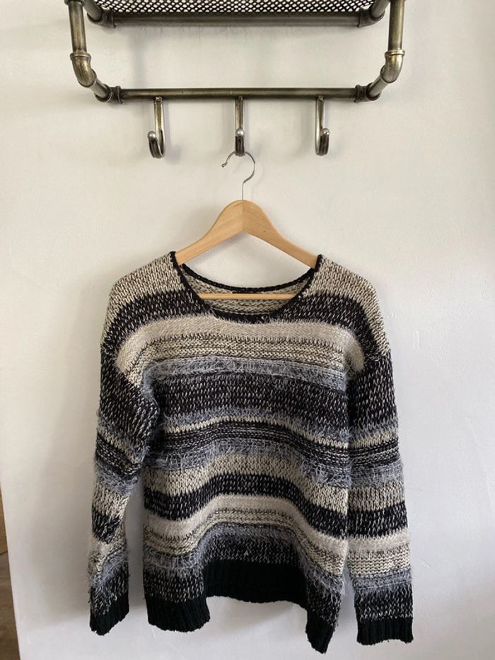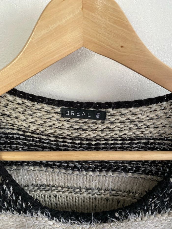 Pull noir et blanc, grosses mailles, porté peu de fois. Taille : 3 -> je pense que c’est du M Marque : breal Pour plus de renseignements, contactez moi en privé.