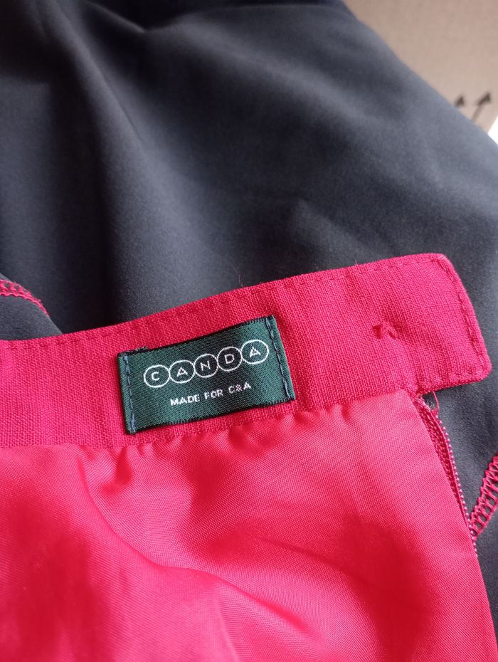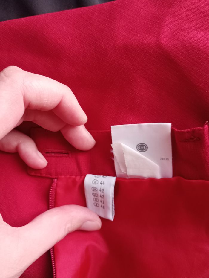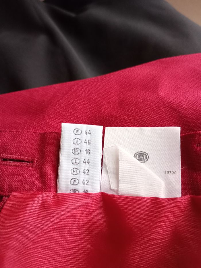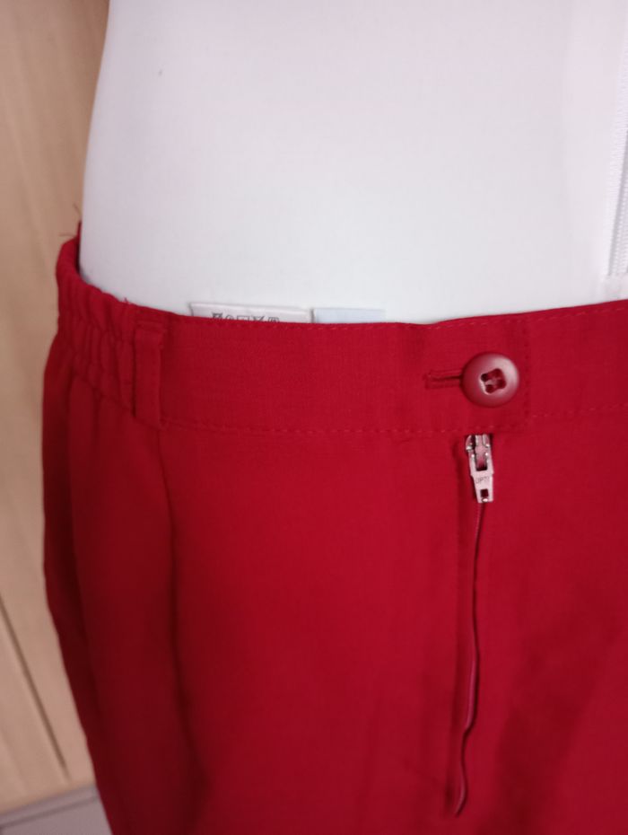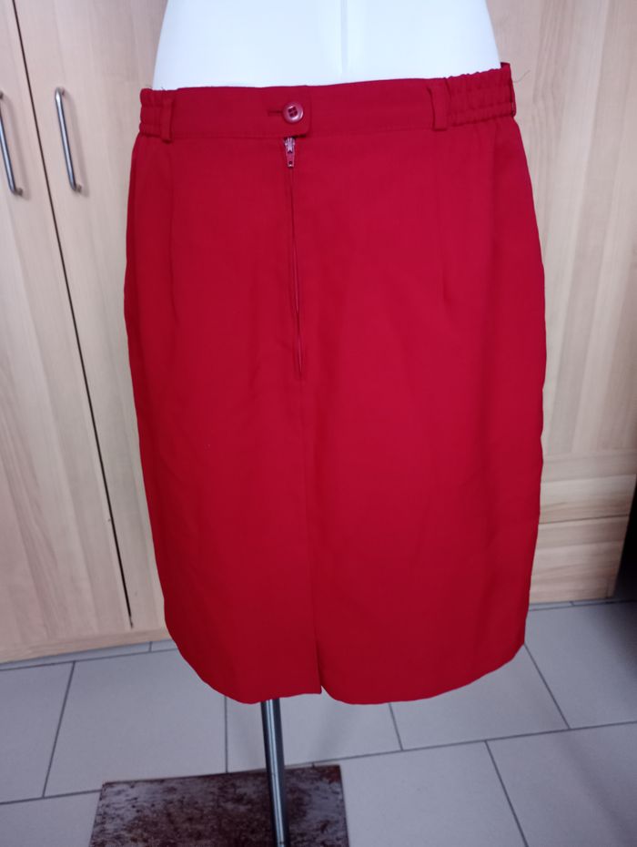 Jupe classique rouge. Taille : 44. Marque : C&A Longueur : 56 cm Largeur taille (avec élastique) : 37 cm Largeur hanches : 52 cm Très bon état.