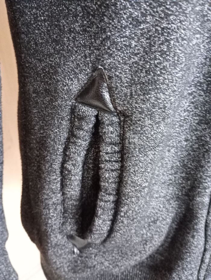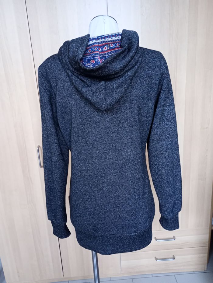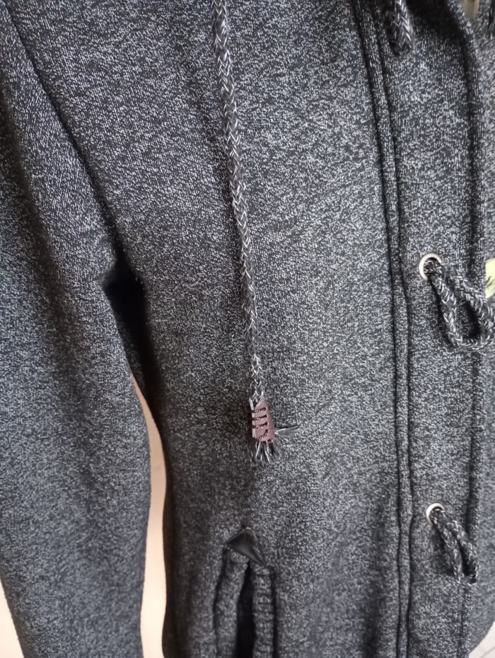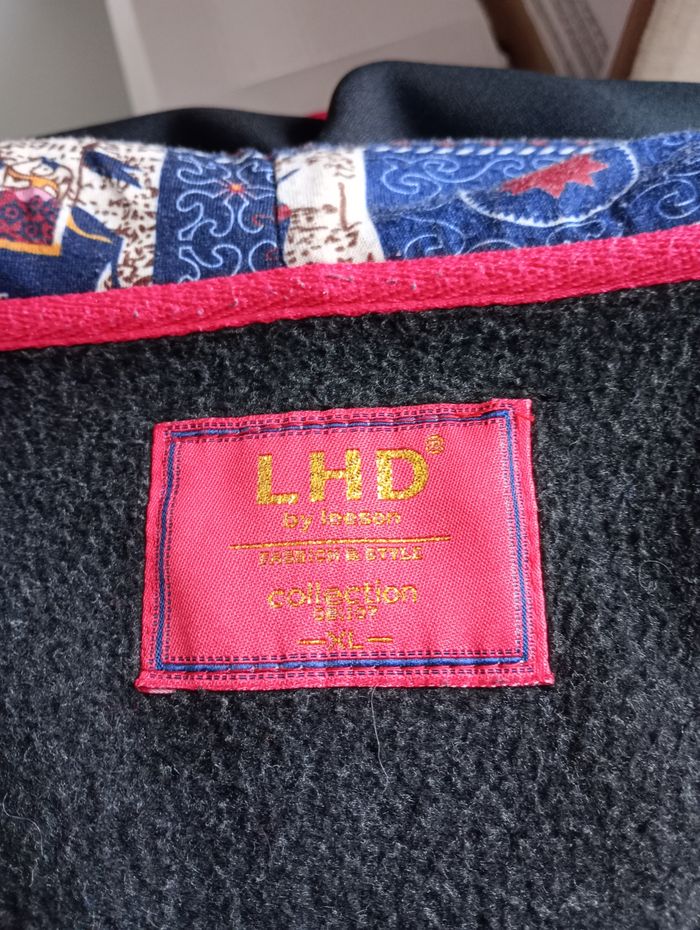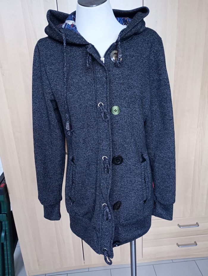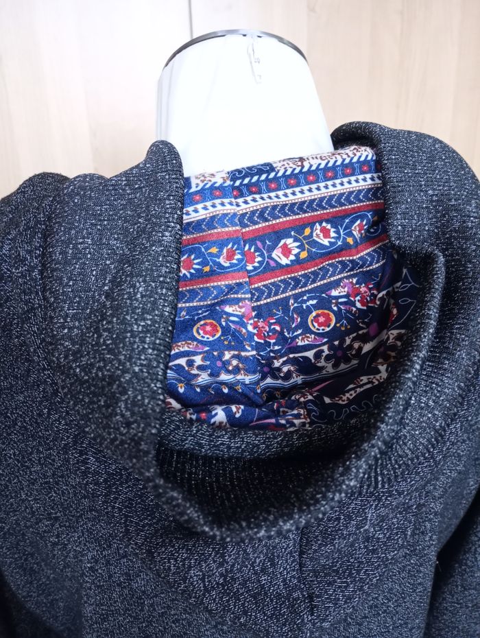 Manteau mi-saison avec capuche. Gris chiné et motif au niveau de la capuche. Très confortable. Manches très longues. Taille : XL Marque : LHD. Longueur : 77 cm. Largeur entre aisselles : 50 cm. Longueur manches: 69 cm. Très bon état.