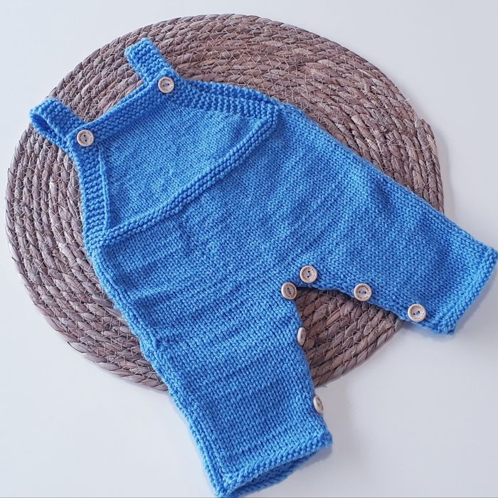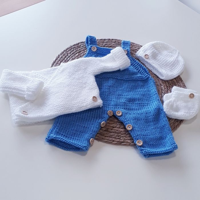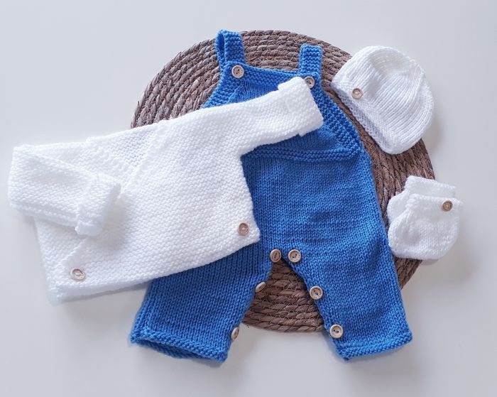 Salopette bébé naissance entièrement faite à la main. Vendue avec la brassière layette tricotée au point mousse avec du fil blanc tout doux pour bébé, un bonnet et des petits chaussons assortis.