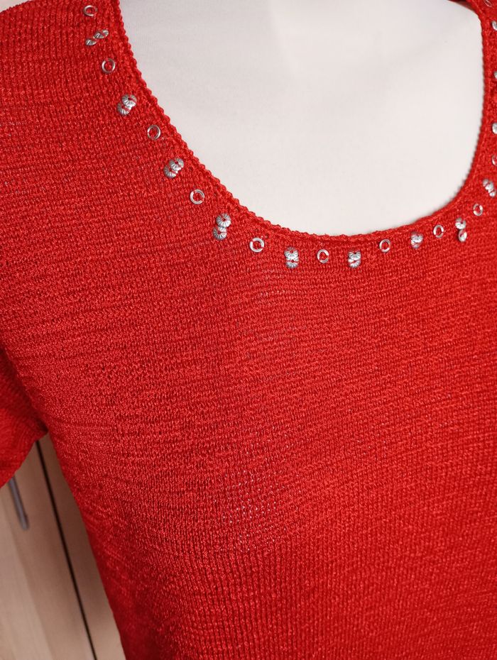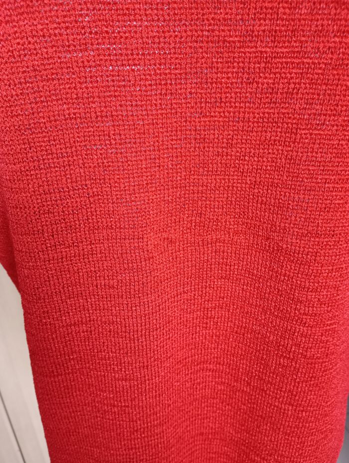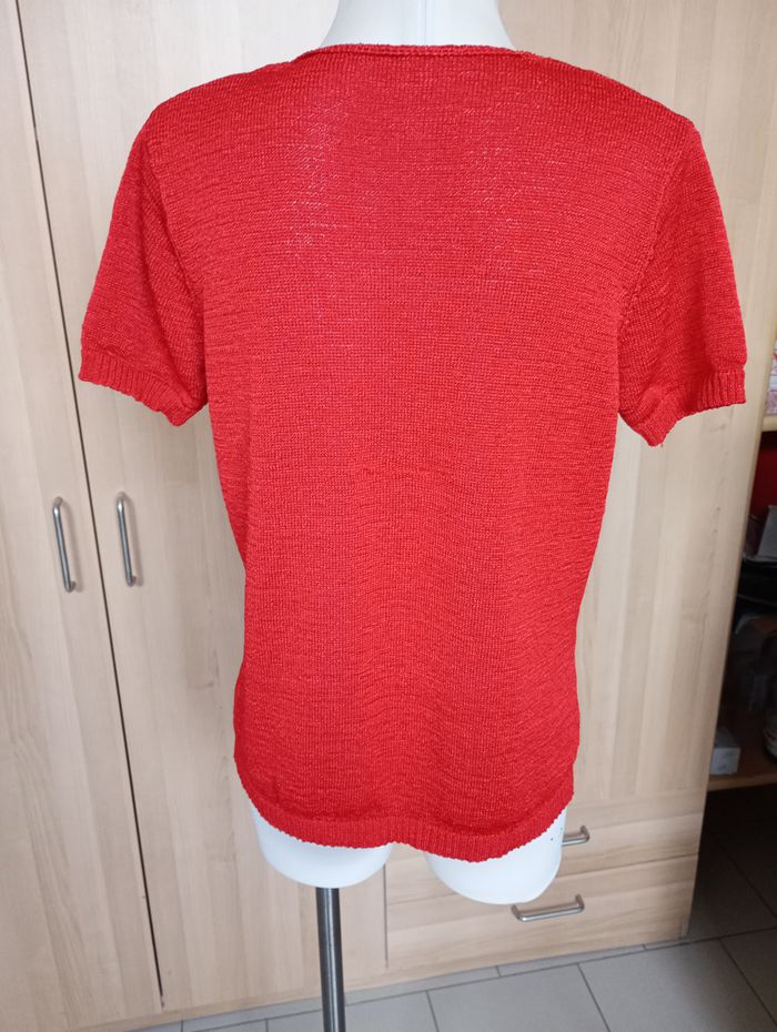 Pull manches courtes en mailles rouge-orange. Il y a comme un petit défaut (?) à l'arrière mais j'ai dû bien regarder pour le voir. Pas d'étiquette. Devrait être un 42/44. Longueur : 63 cm Largeur entre aisselles : 49 cm Très bon état.