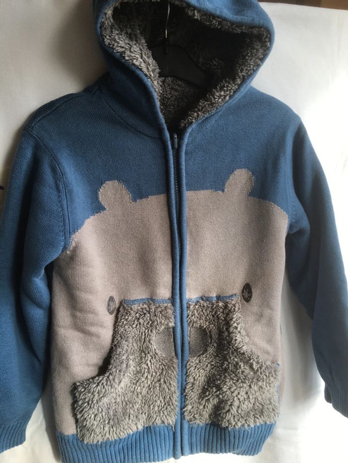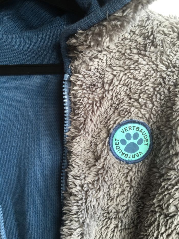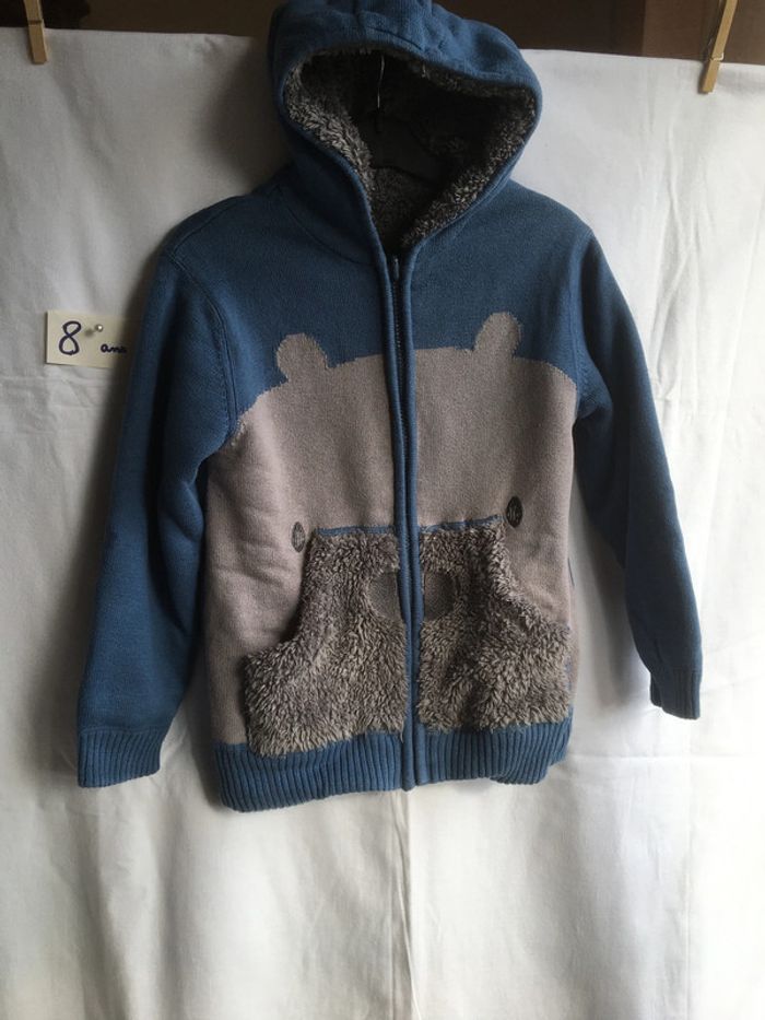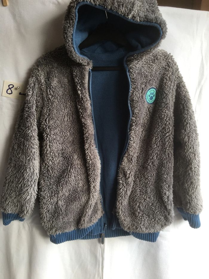 Gilet blouson Réversible - 8 ans Avec capuche attenante Un coté lainage bleu Avec poches kangourou fourrure Un côté fourrure et 2 poches Vertbaudet Excellent état et très confortable