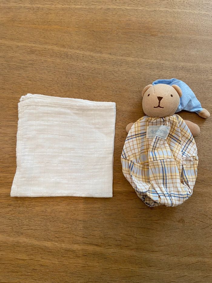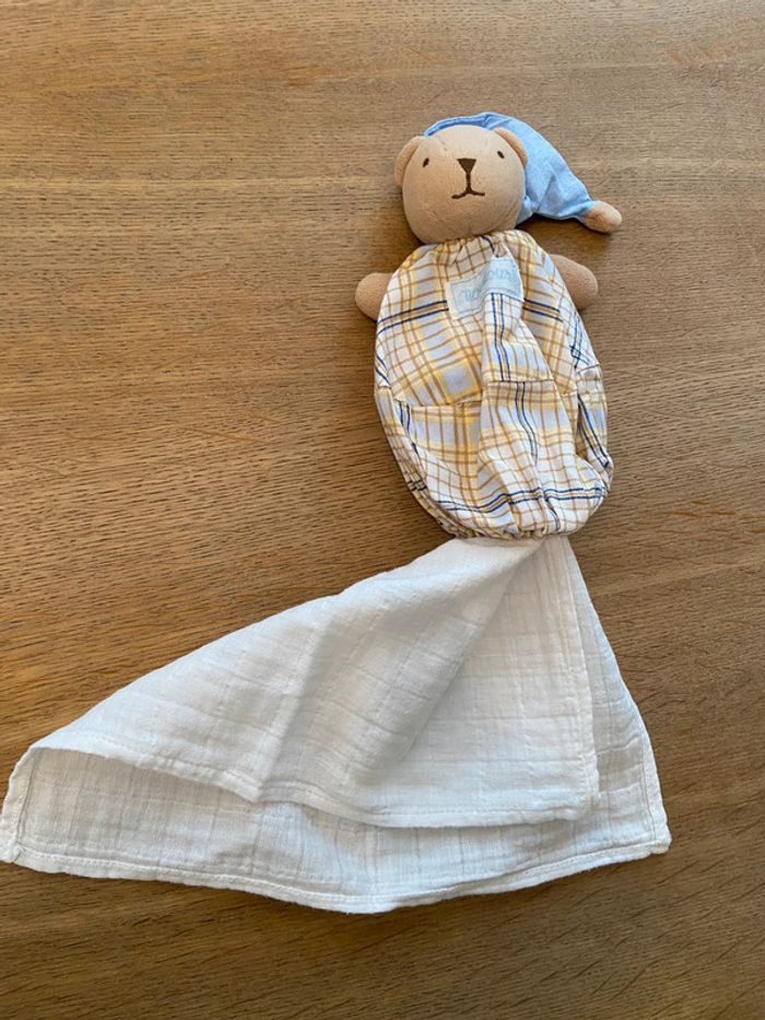 Petit doudou accompagné de son petit carré gaze de coton escamotable Nounours état neuf