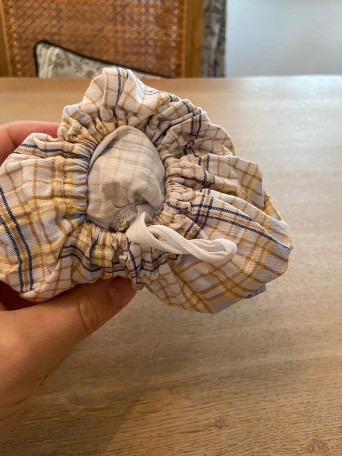 En parfait état. Petit doudou tête d’ours, corps souple comme un petit sac contenant un petit carré en gaze de coton blanc immaculé à nouer dans le corps du doudou pour éviter la perte. Idéal pour occuper bébé et garder le carré propre. En parfait état.