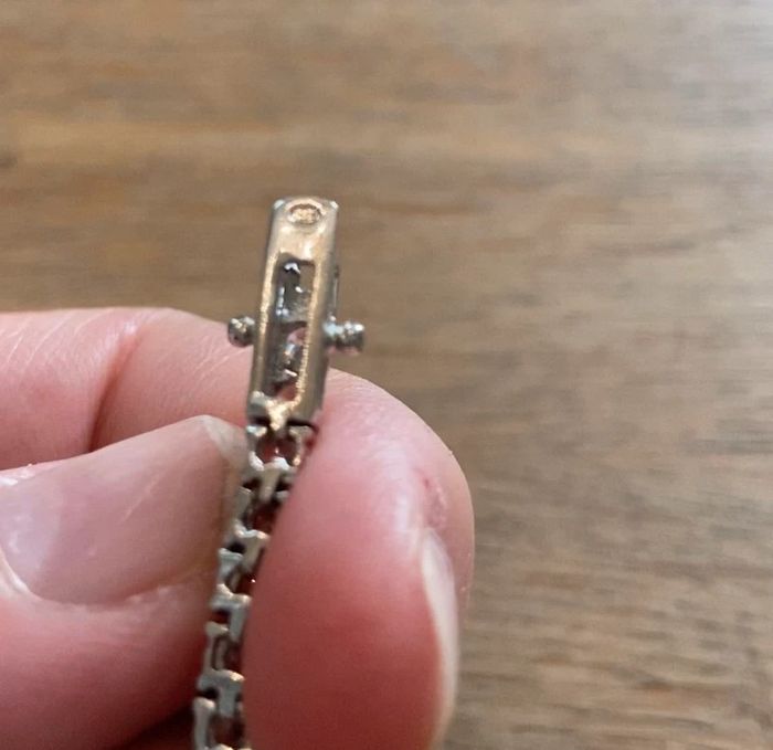 État neuf, porté une fois. Zoom fait sur les poinçons. Superbe qualité, fermoir solide. Je n’ai malheureusement plus la facture d’achat. La qualité des pierres est parfaite, belle brillance et transparence.