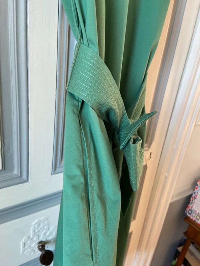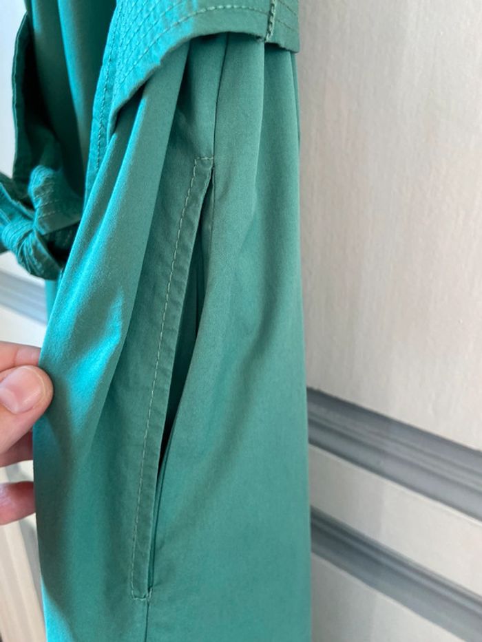 Portée une fois. Superbe popeline de coton souple et très légère, ultra agréable à porter. Passants fins à la taille pour ceinture assortie amovible. Joli col V. Poches latérales. Longueur 116 cm.