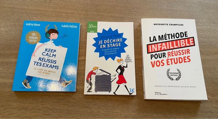 Lot de trois livres guides pour réussir ses études : stage, examens et études supérieures.