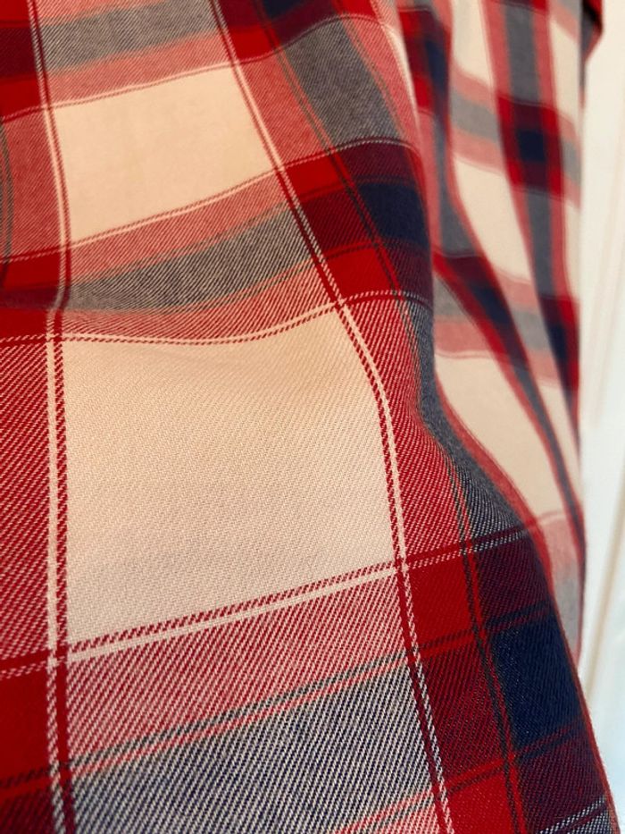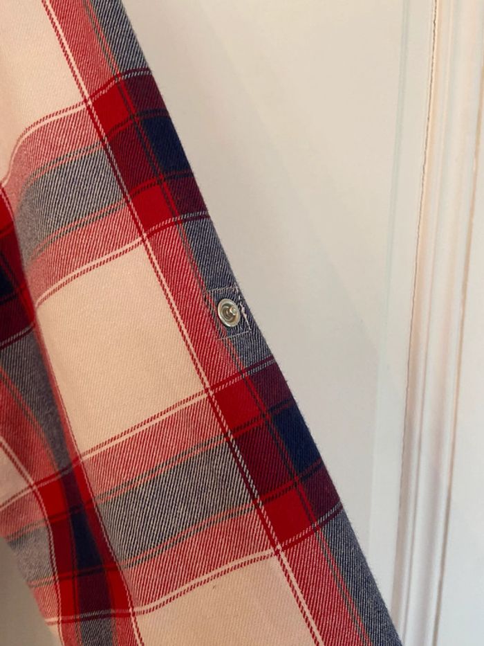 Jamais portée, très jolie chemise en pur coton légèrement gratté très doux. Belles couleurs lumineuses. Fermeture devant et poignets par pressions, pattes sur les manches pour permettre un porté relevé. Forme légèrement liquette, dos arrondi et plus long que le devant. Poches poitrine. Largeur aisselle à aisselle 47 cm, largeur épaules 41 cm, longueur dos depuis base du col 70 cm, longueur devant 60 cm depuis le premier bouton.