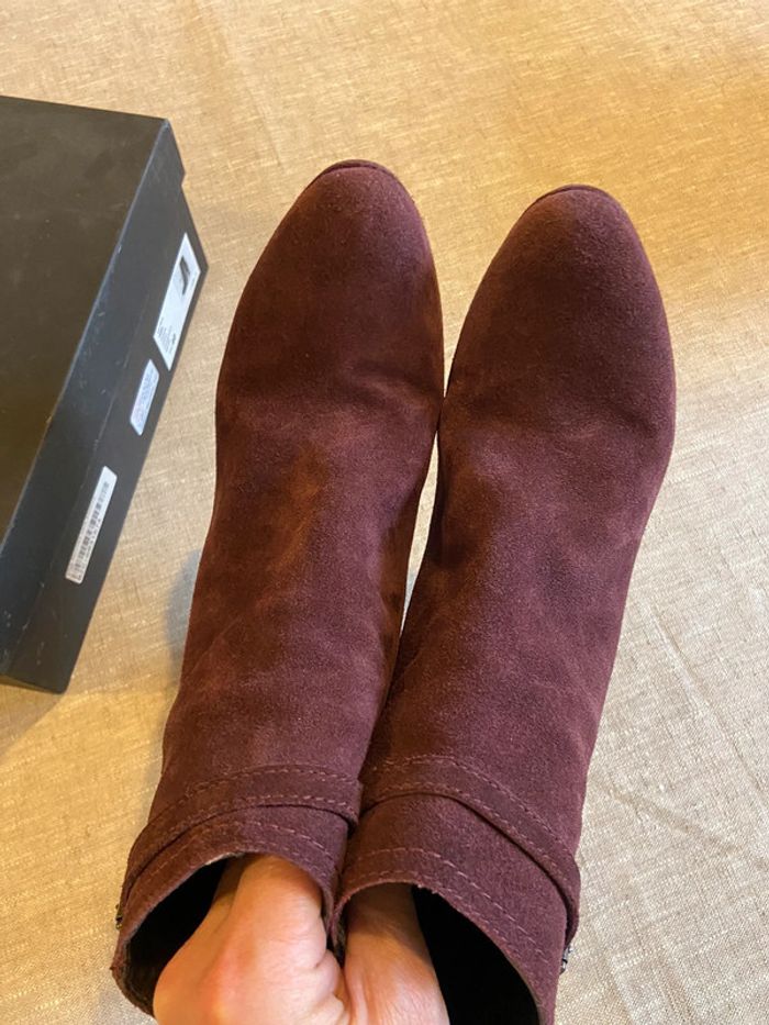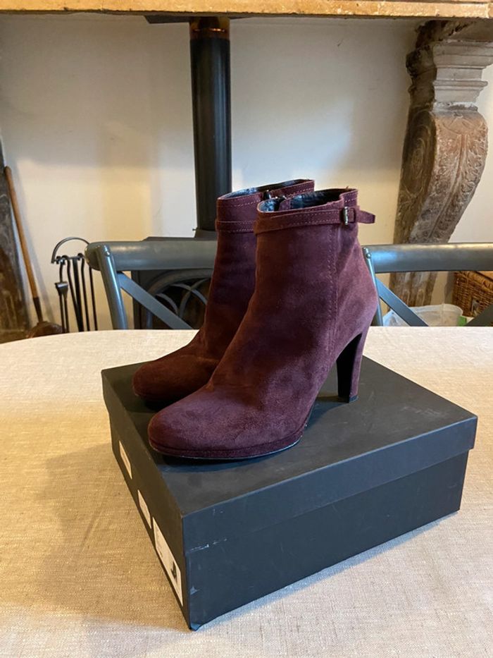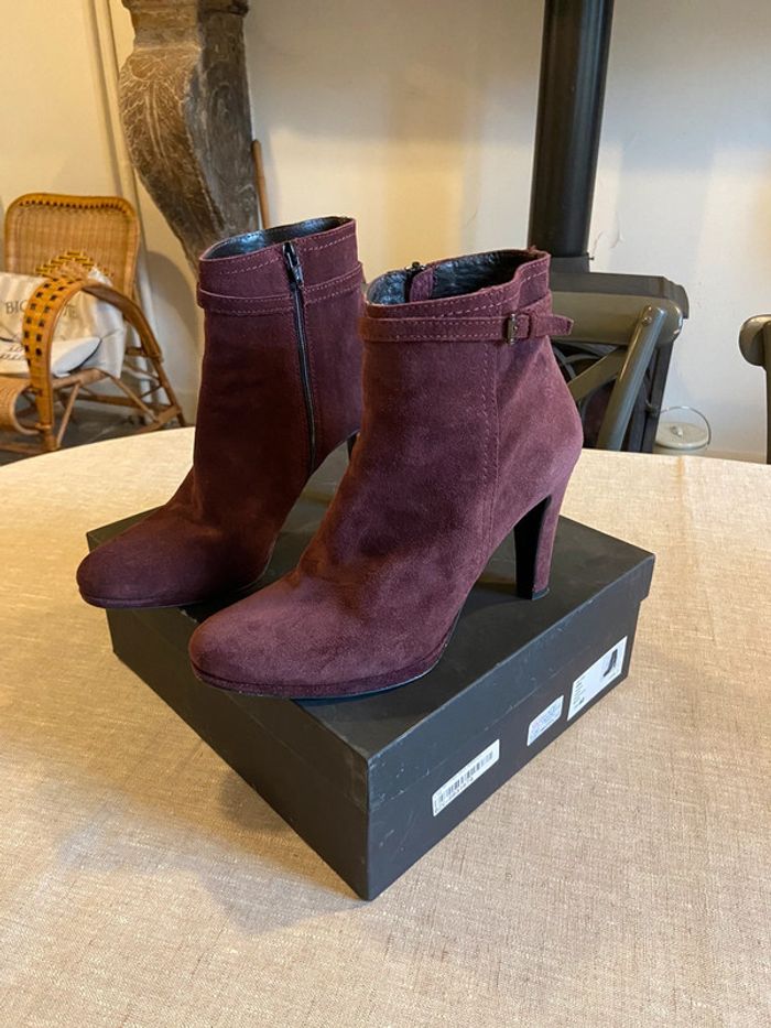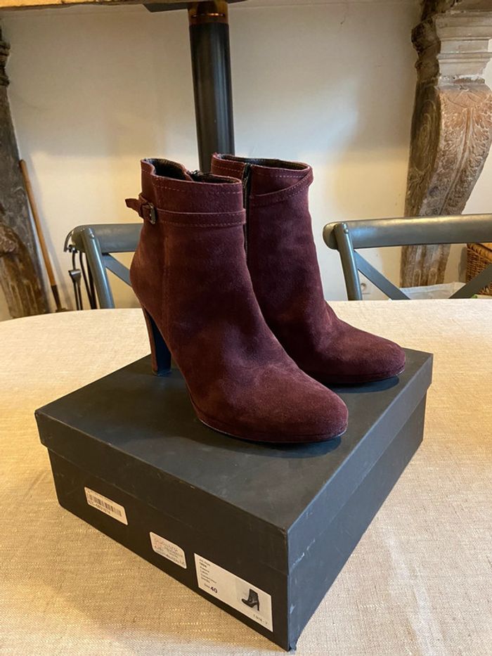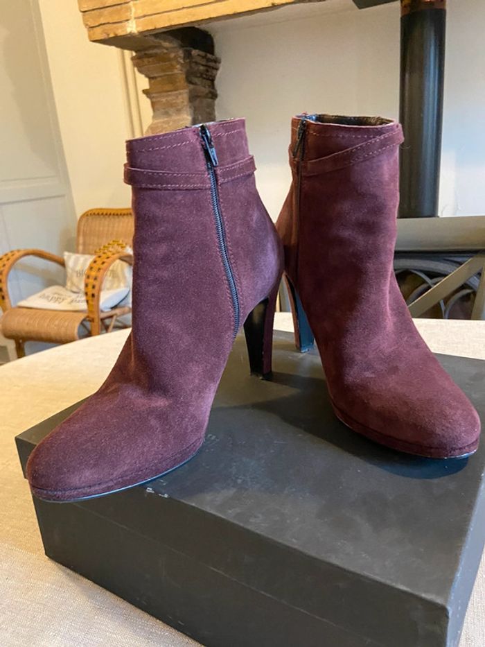 En parfait état, belles bottines en daim bordeaux /prune de très belle qualité. Talons 10 cm avec petite plateforme de 2 cm. Fermeture éclair sur la face antérieure. Confortable, cambrure bien étudiée. Vendues avec leur boîte. Prix d’origine 199€.