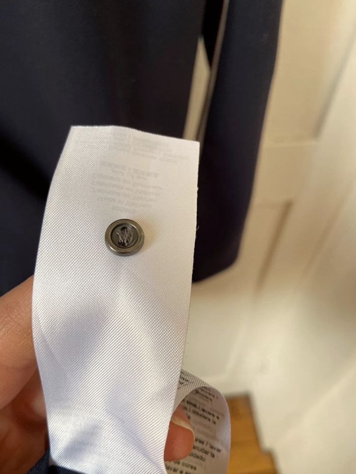 Bandes contrastées sur les manches Longueur 97 cm, 89 cm depuis centre de l’encolure devant, largeur aisselle à aisselle 45 cm Entièrement doublée Plis d’aisance poitrine Beau tombé En parfait état Taille assez petit, convient à un grand 42.