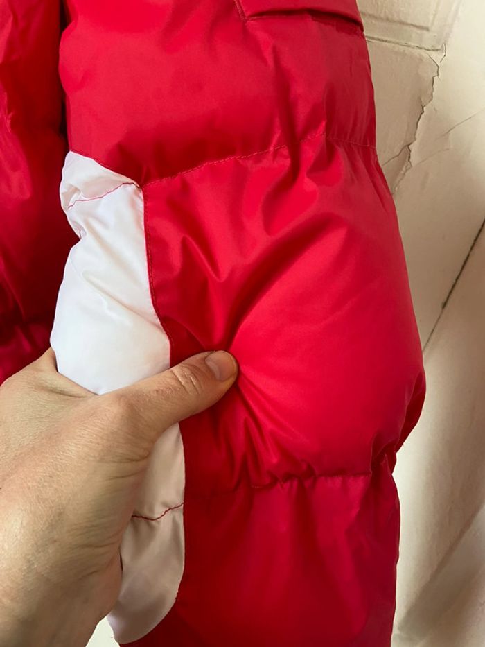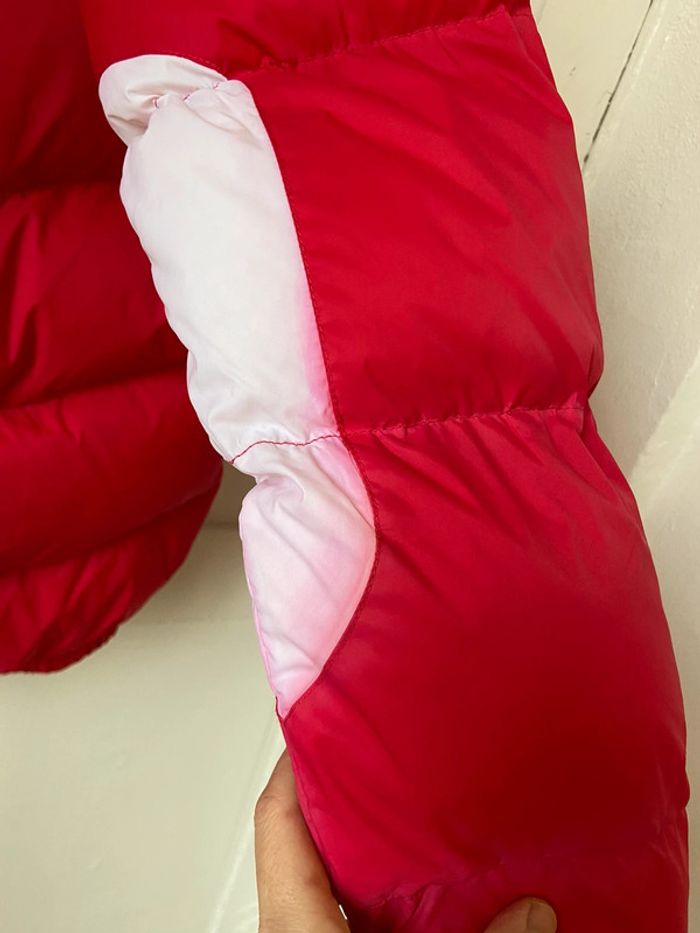 Doudoune très chaude, épaisse et très gonflante portée 3 jours. La couleur a un peu dégorgé au lavage sur les empiècements blancs des manches, voir photos. Hormis cela l’état est impeccable. Capuche bordée de fausse fourrure. Deux poches intérieures et deux poches latérales.