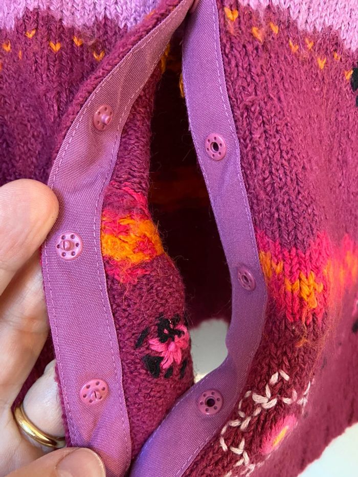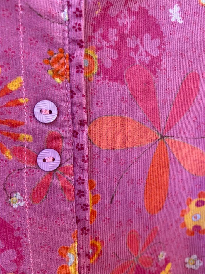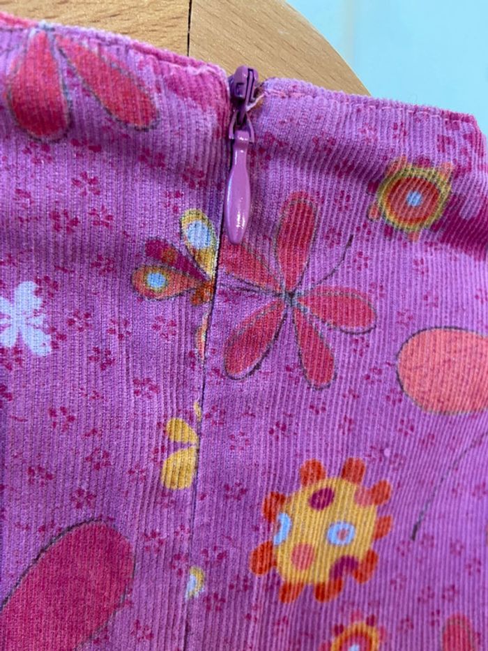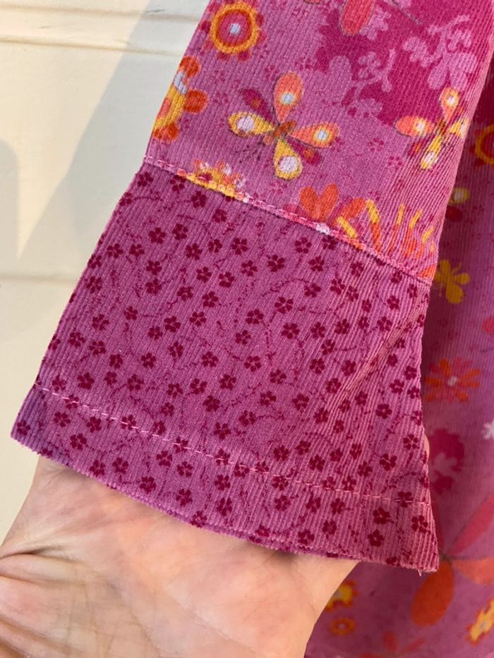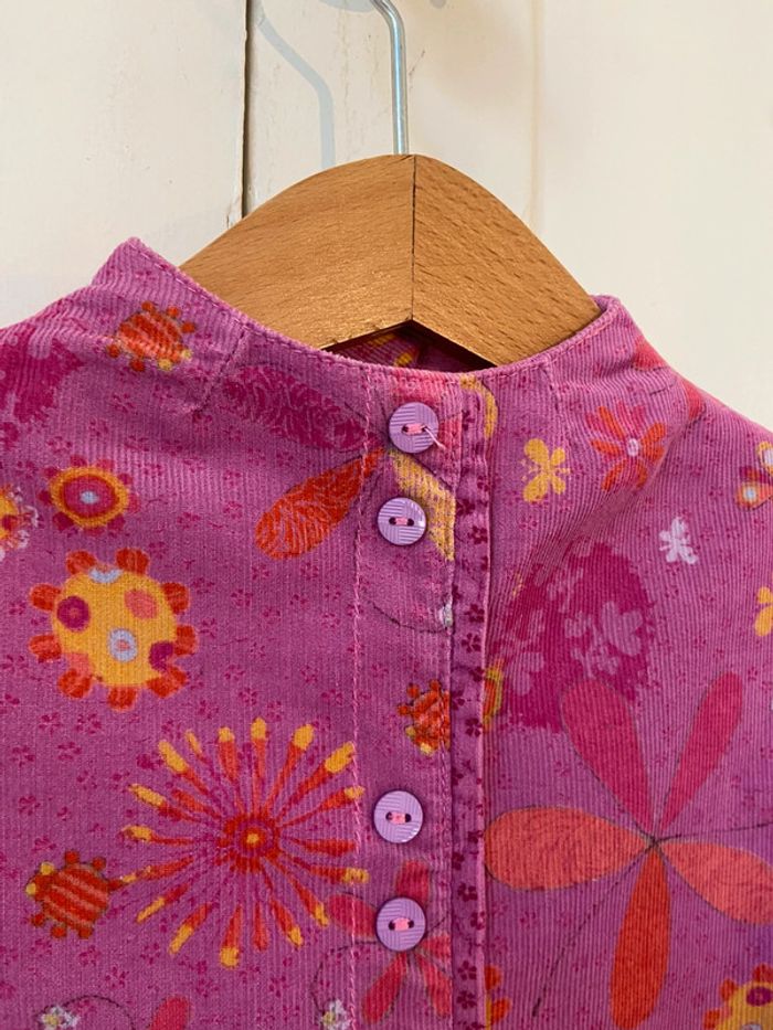 Ensemble composé d’une robe en velours côtelé, fermeture éclair invisible au dos, devant faux boutonnage, impression double épaisseur au bas de la robe, manches légèrement évasées, et d’un gilet très doux et bien chaud à manches évasées également, fermeture par pressions invisibles sur ruban gros grain. En très bon état.